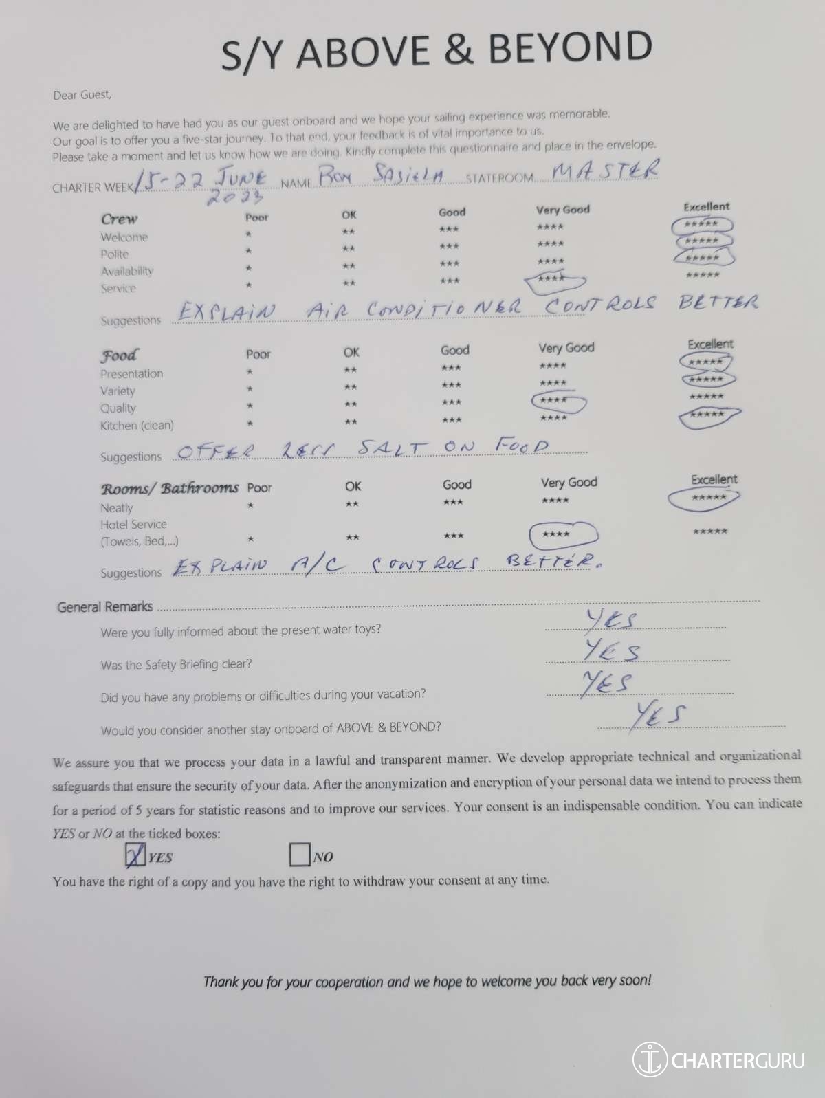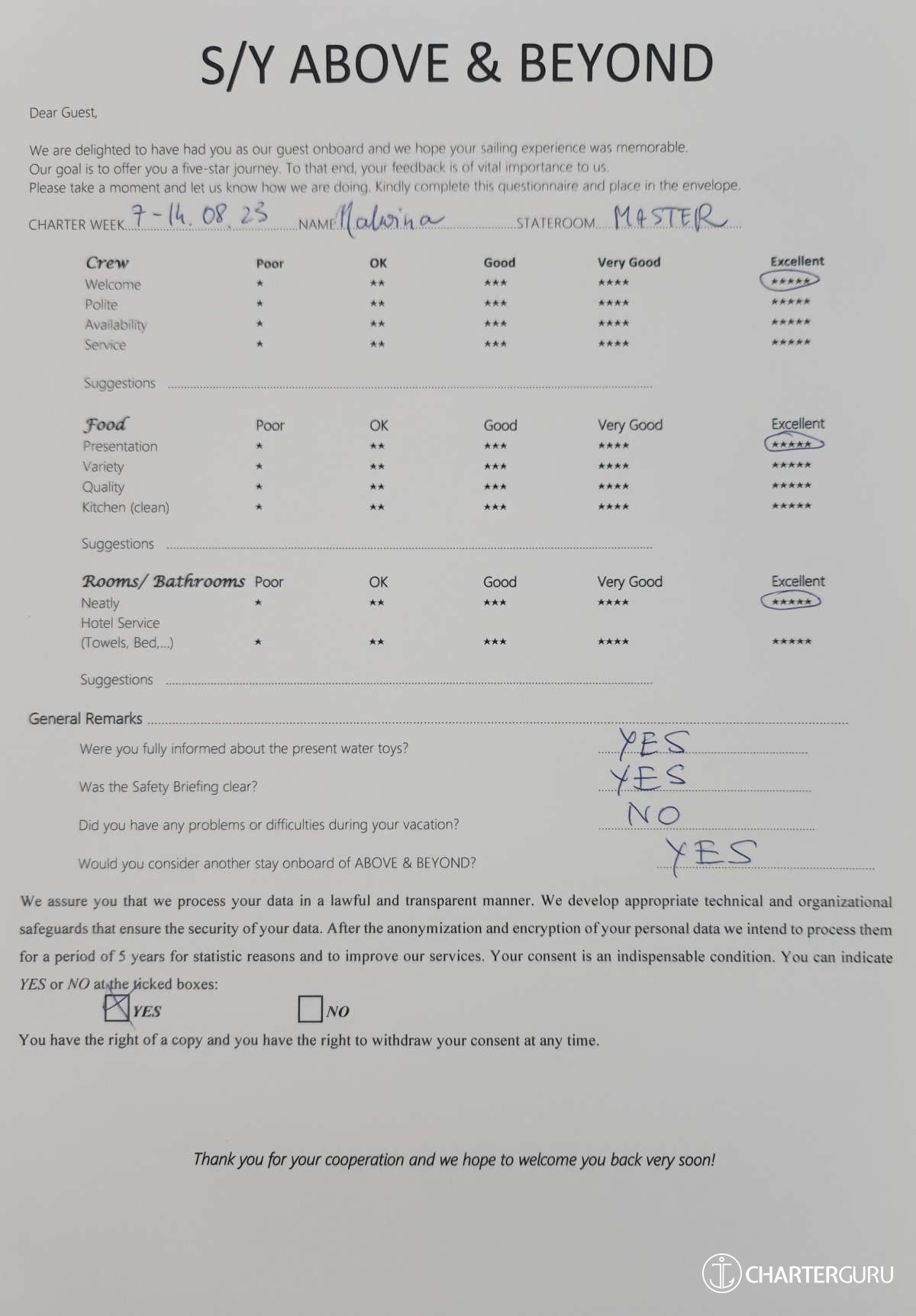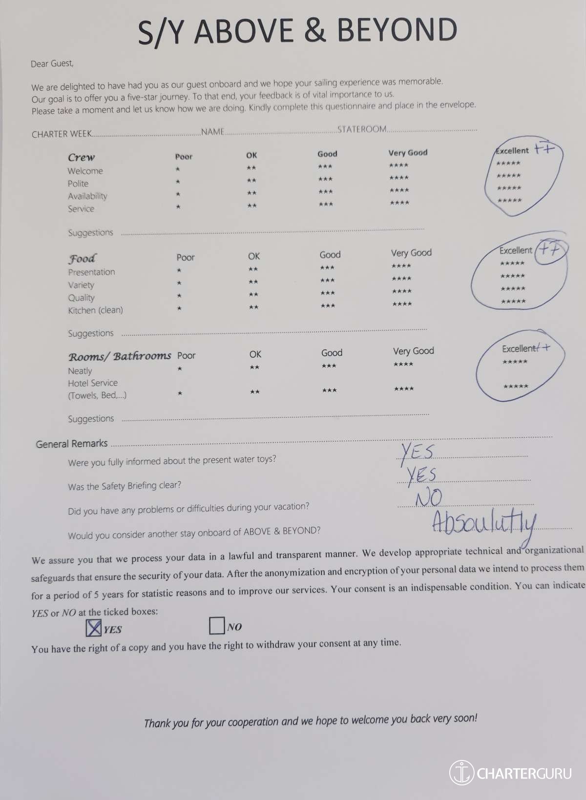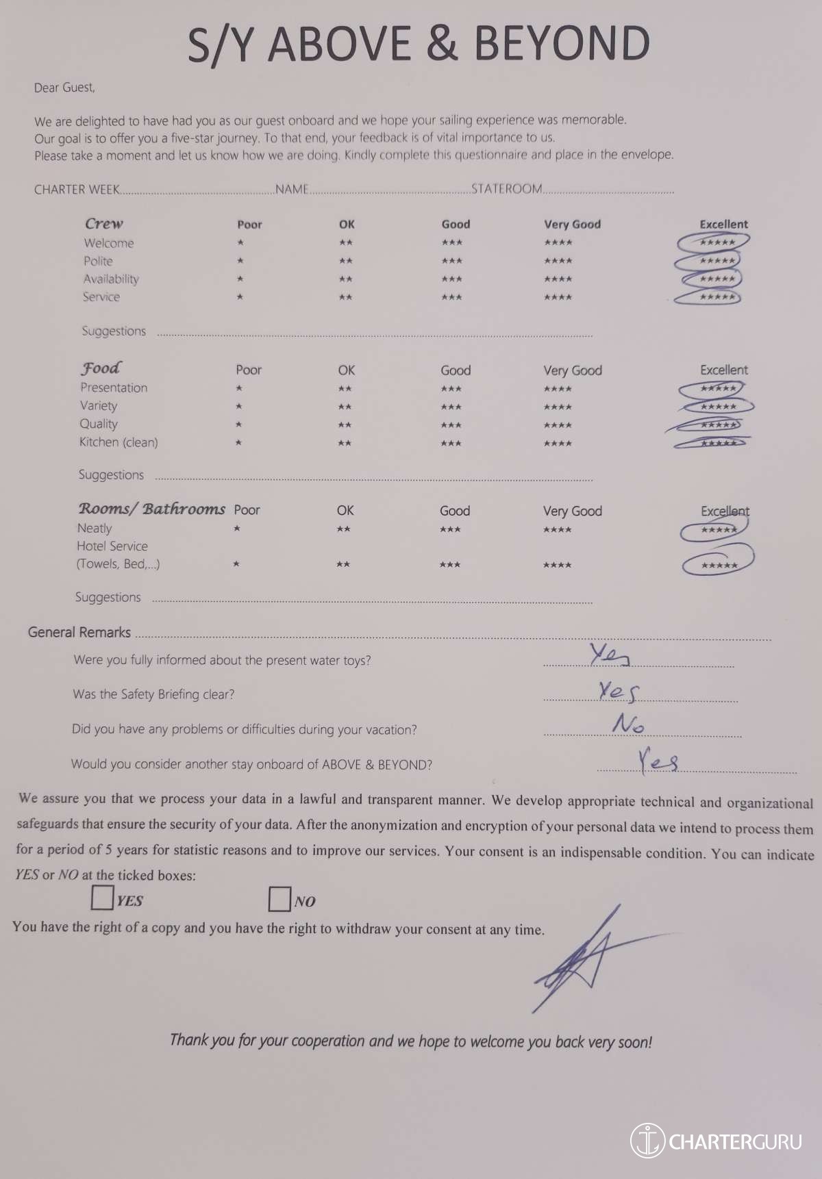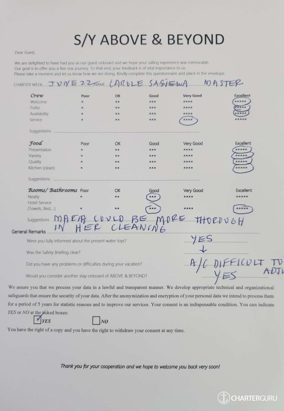 For a sailing catamaran like ABOVE & BEYOND, the expected APA is 20% to 35% of the charter price (€11,000 - €19,250), making the charter cost €66,000 to €74,250. Exact amount will be confirmed after inquiry.