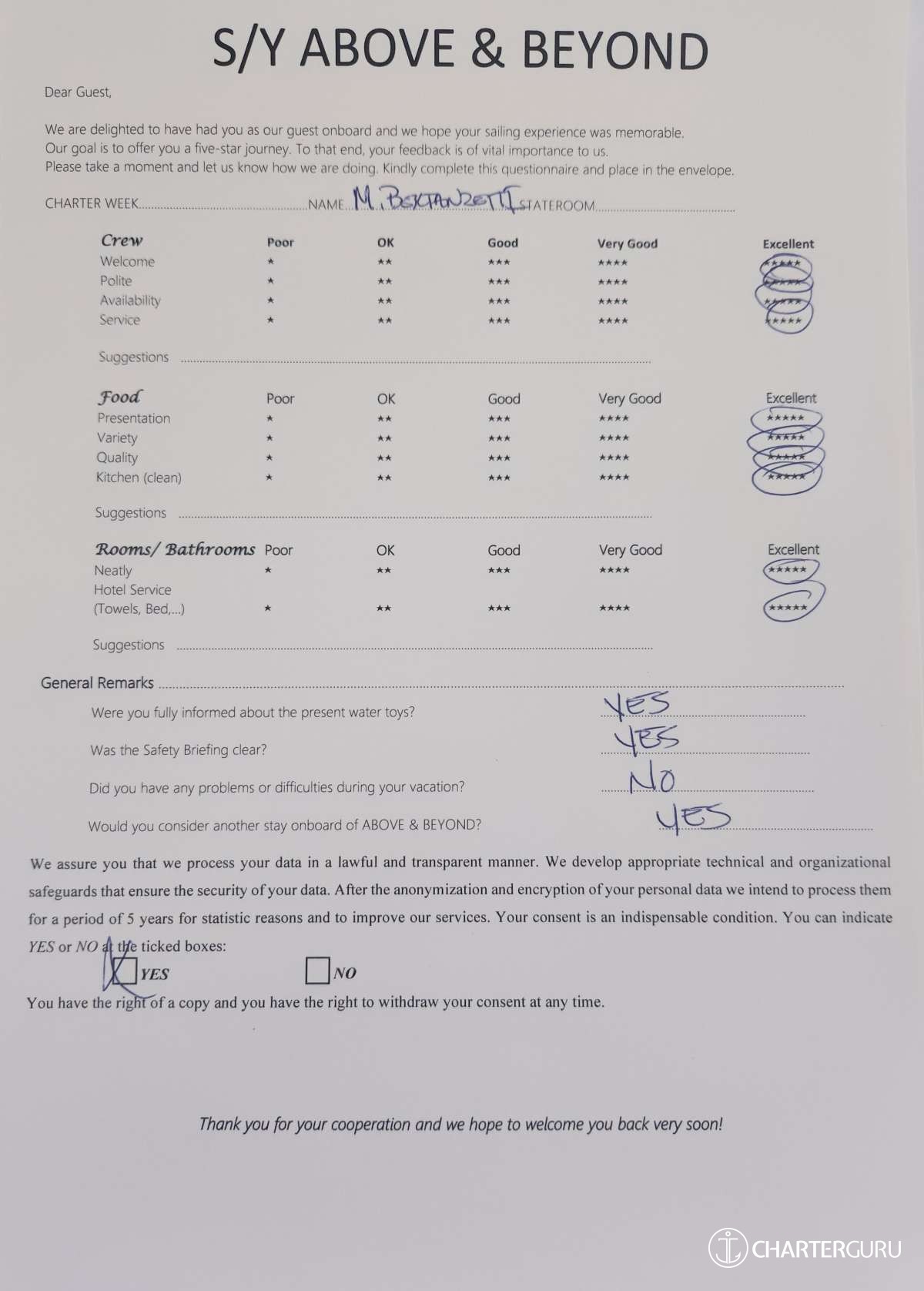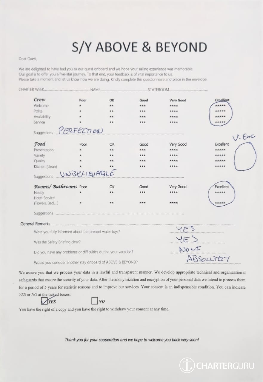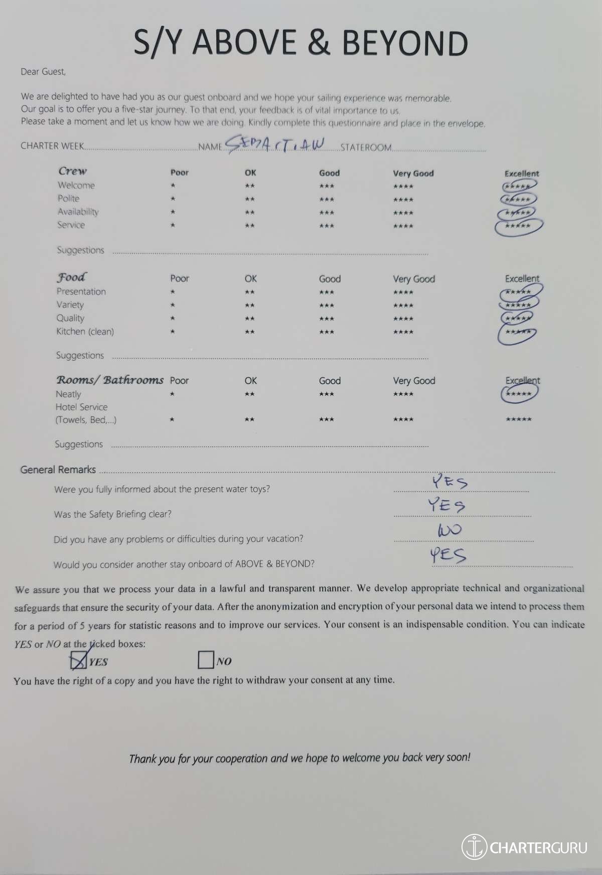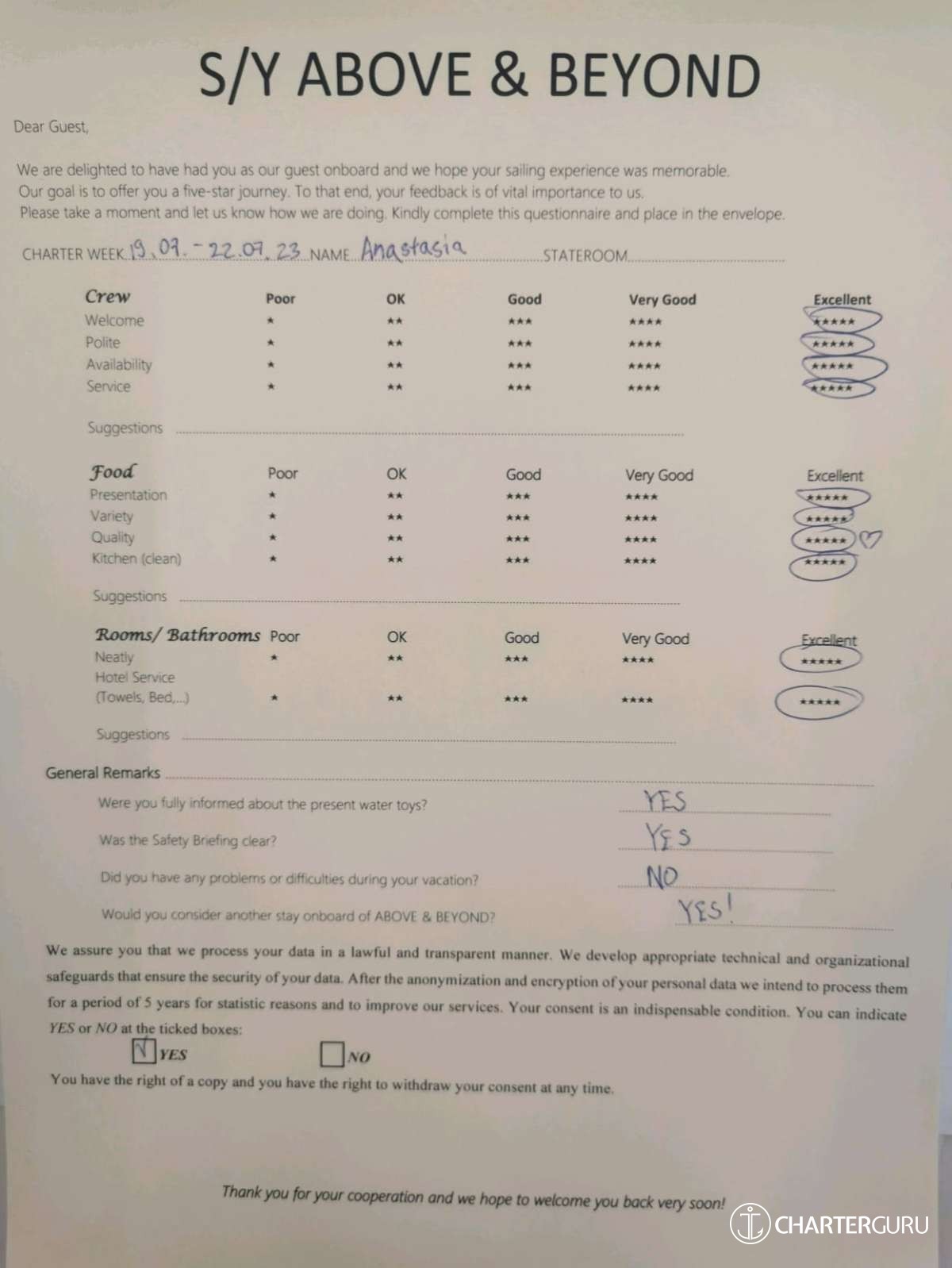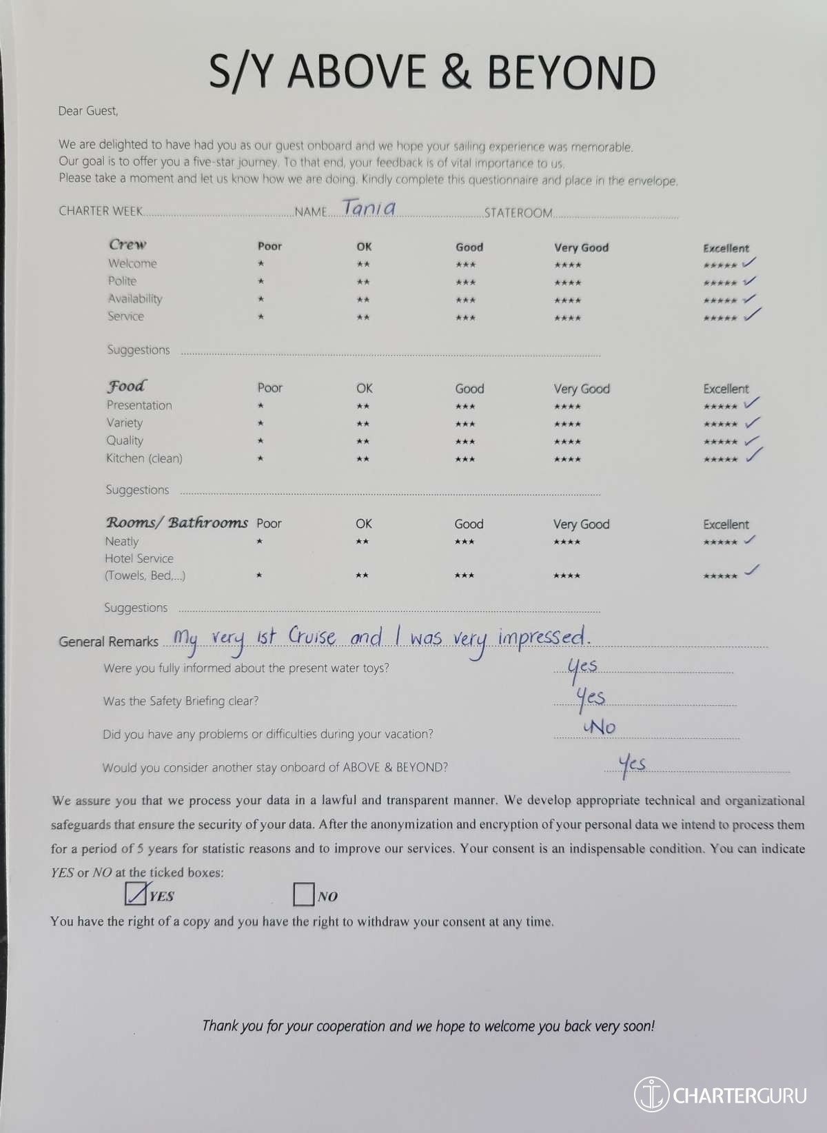 For a sailing catamaran like ABOVE & BEYOND, the expected APA is 20% to 35% of the charter price (€11,000 - €19,250), making the charter cost €66,000 to €74,250. Exact amount will be confirmed after inquiry.