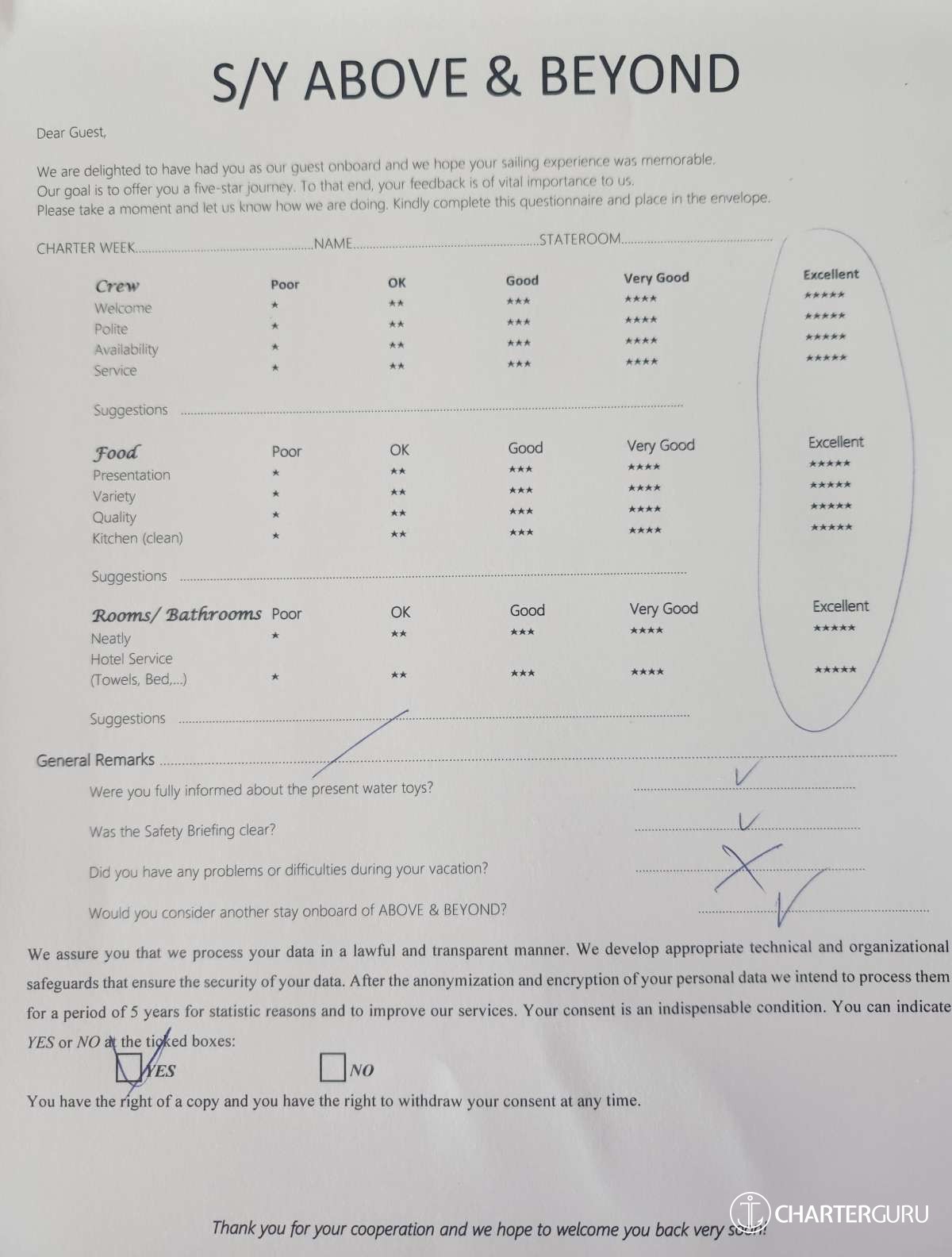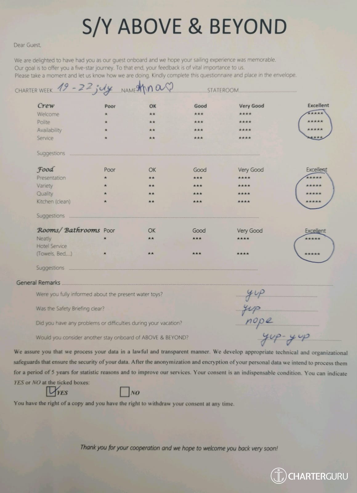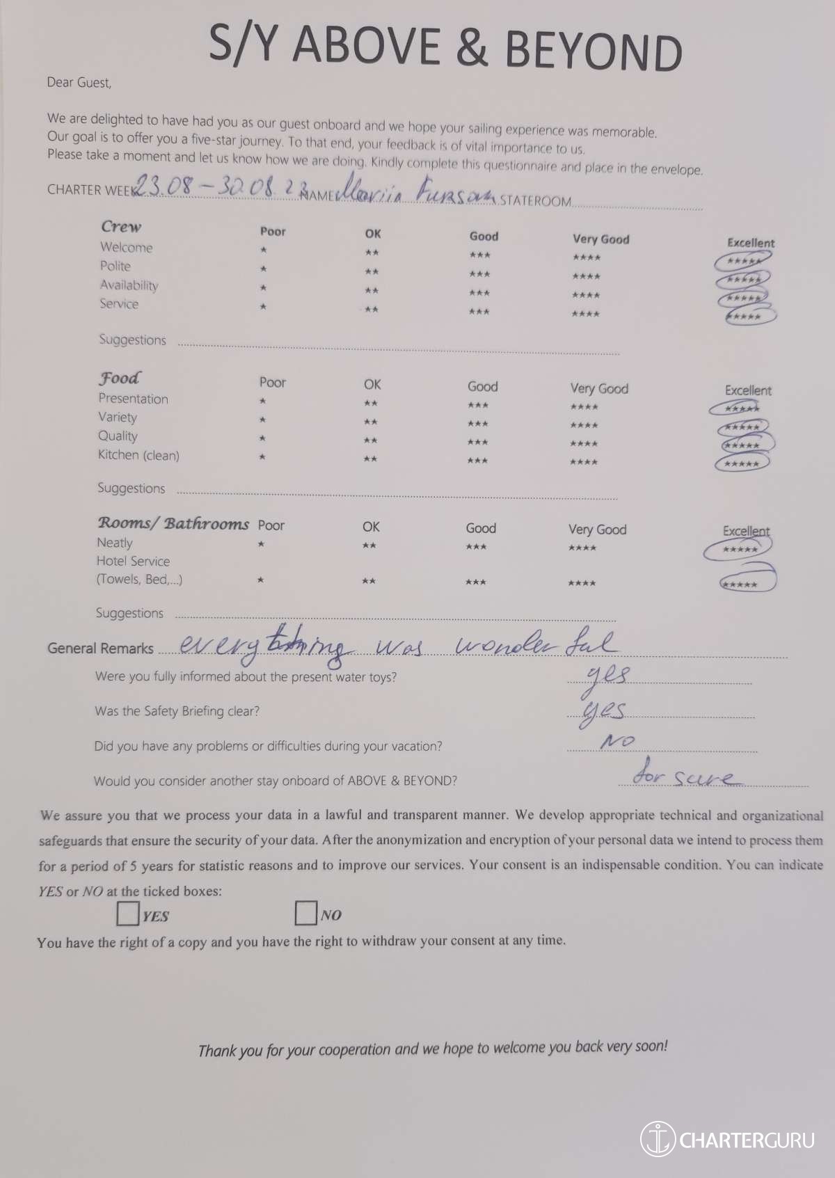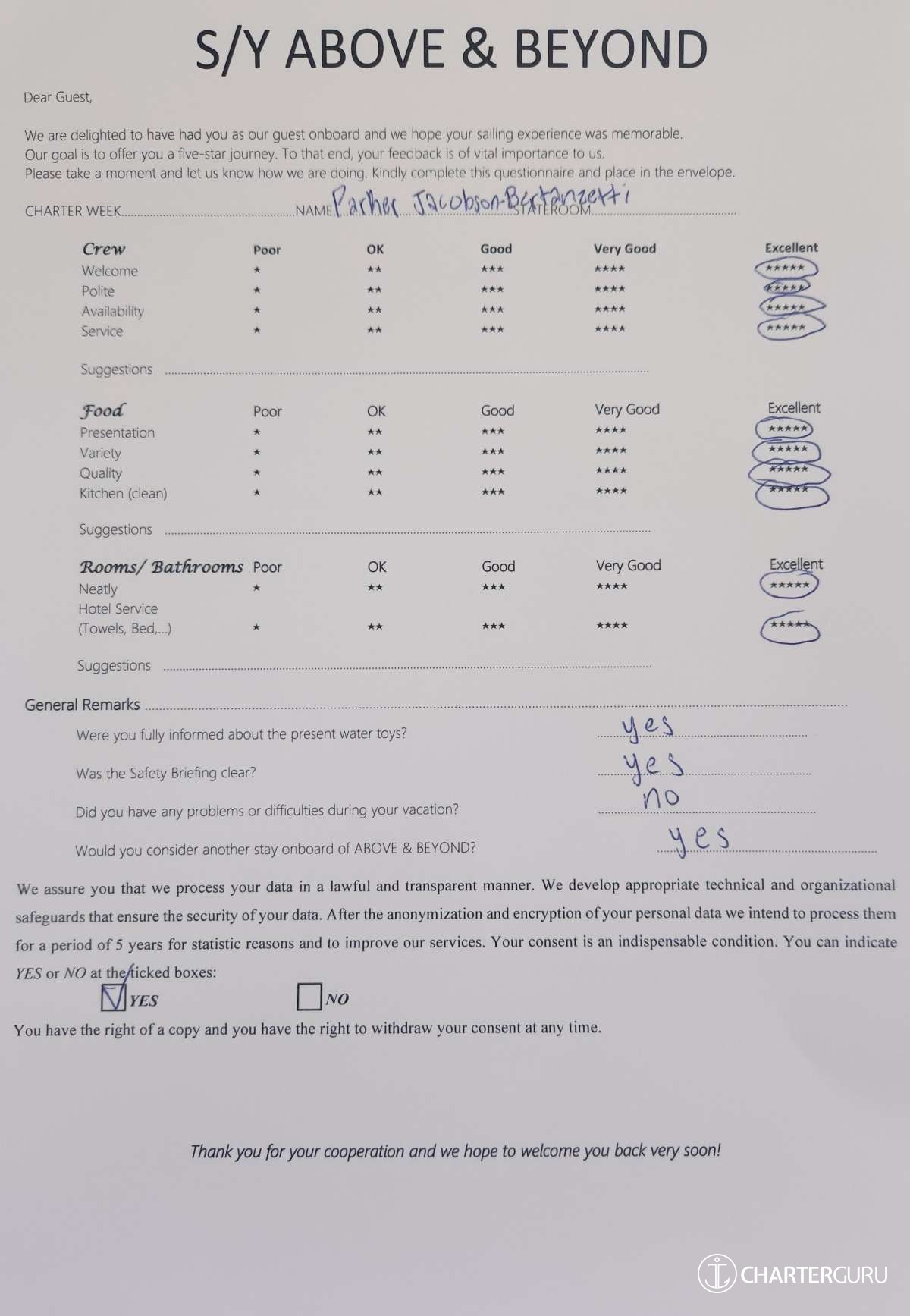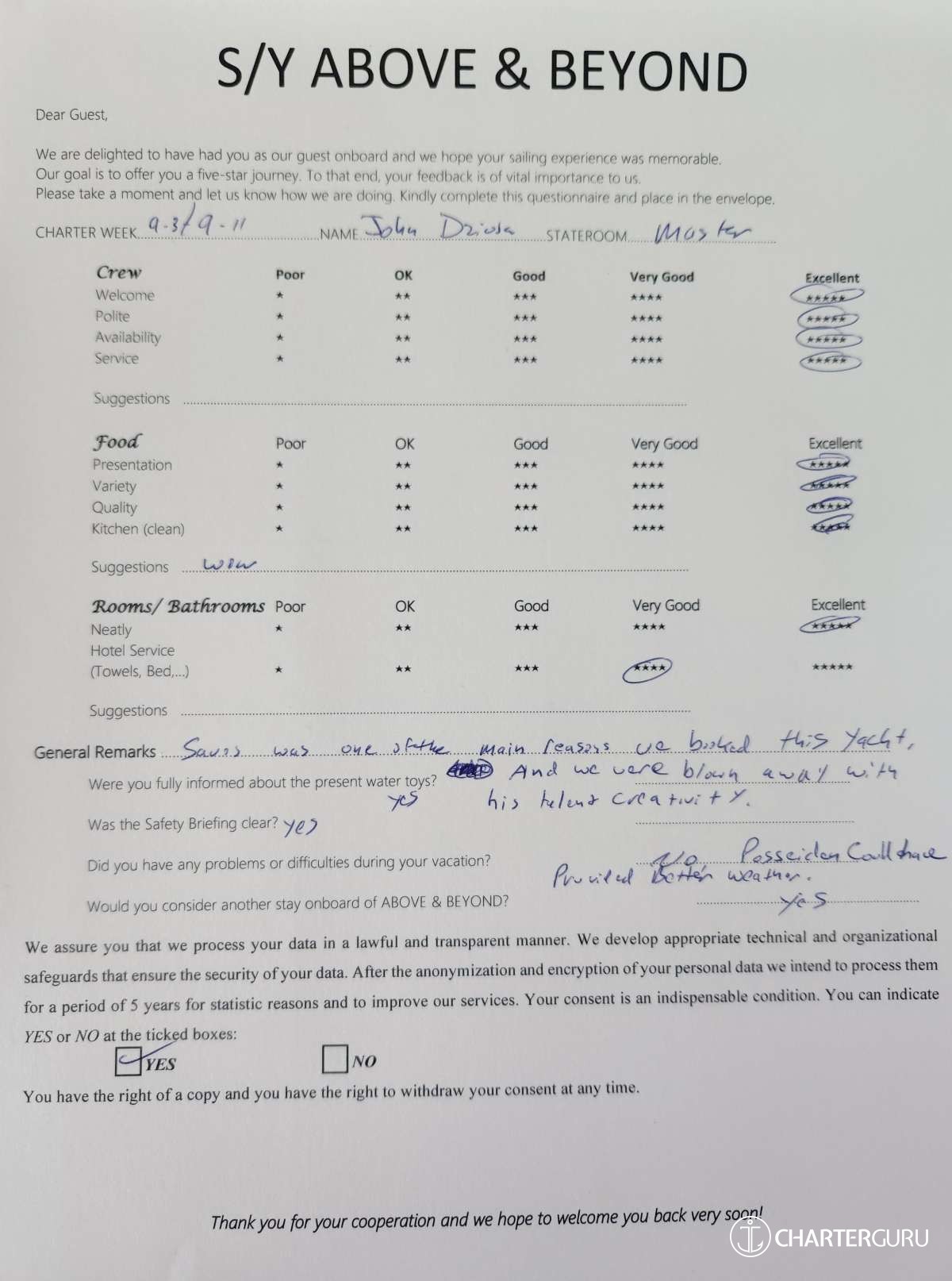 For a sailing catamaran like ABOVE & BEYOND, the expected APA is 20% to 35% of the charter price (€11,000 - €19,250), making the charter cost €66,000 to €74,250. Exact amount will be confirmed after inquiry.