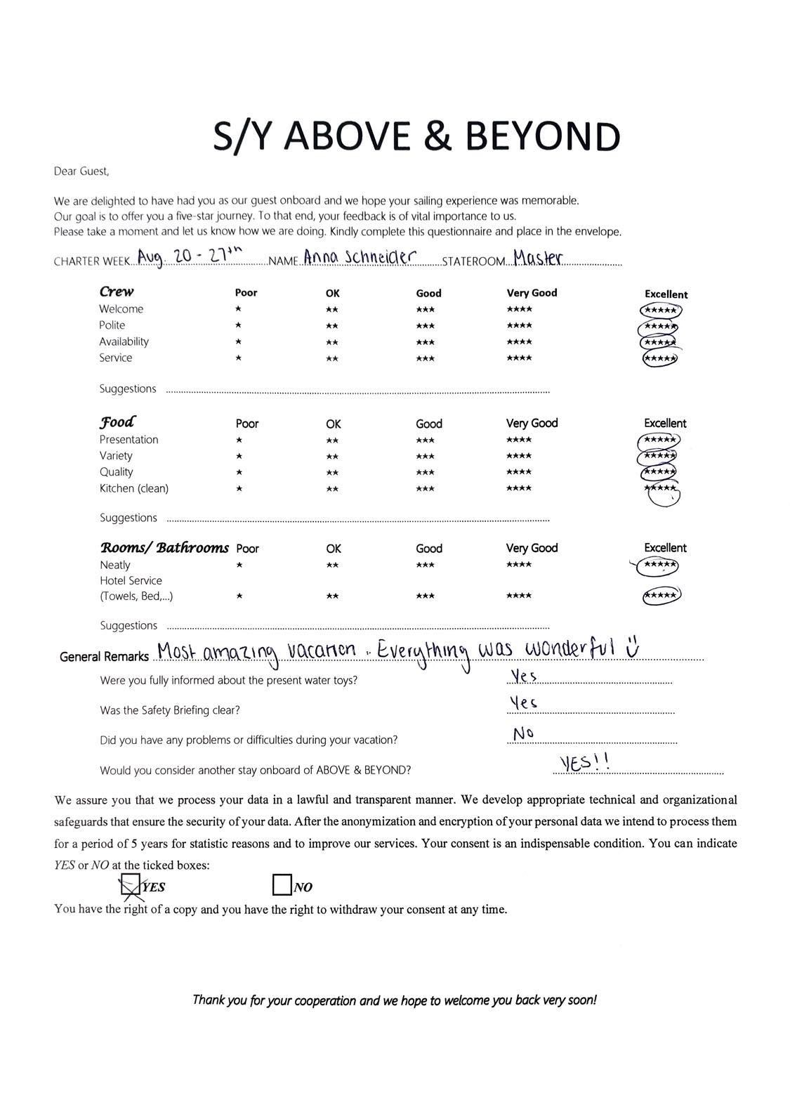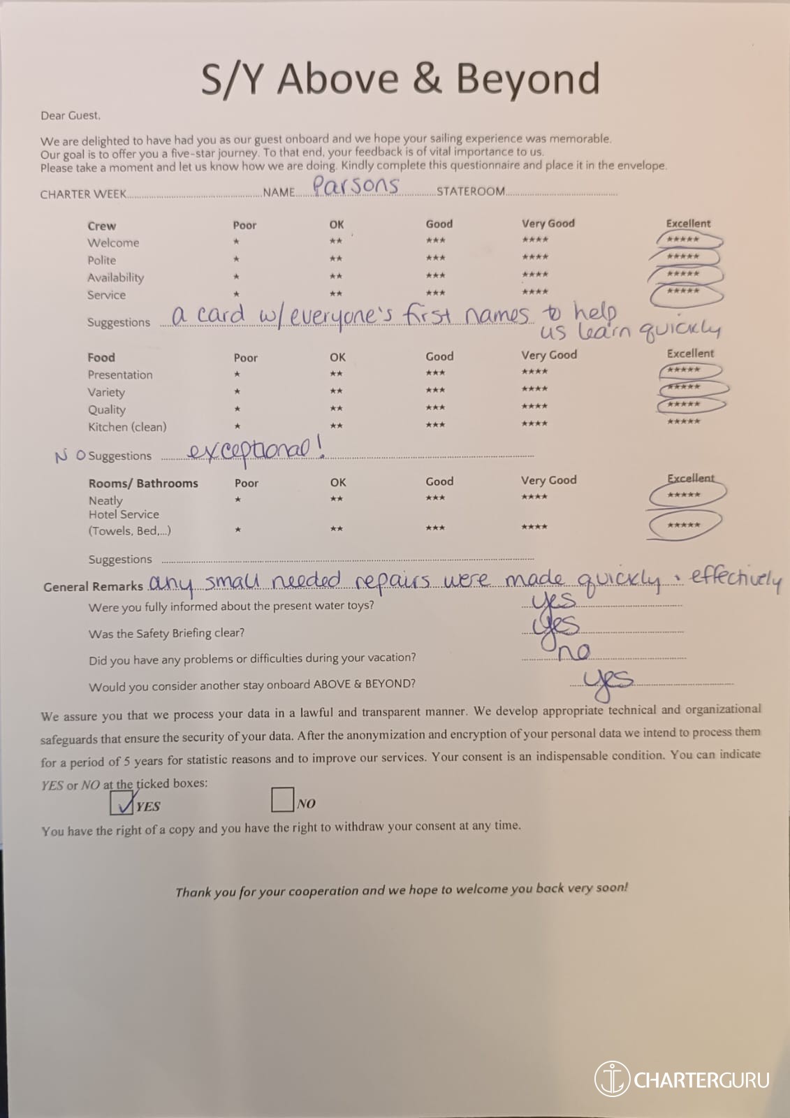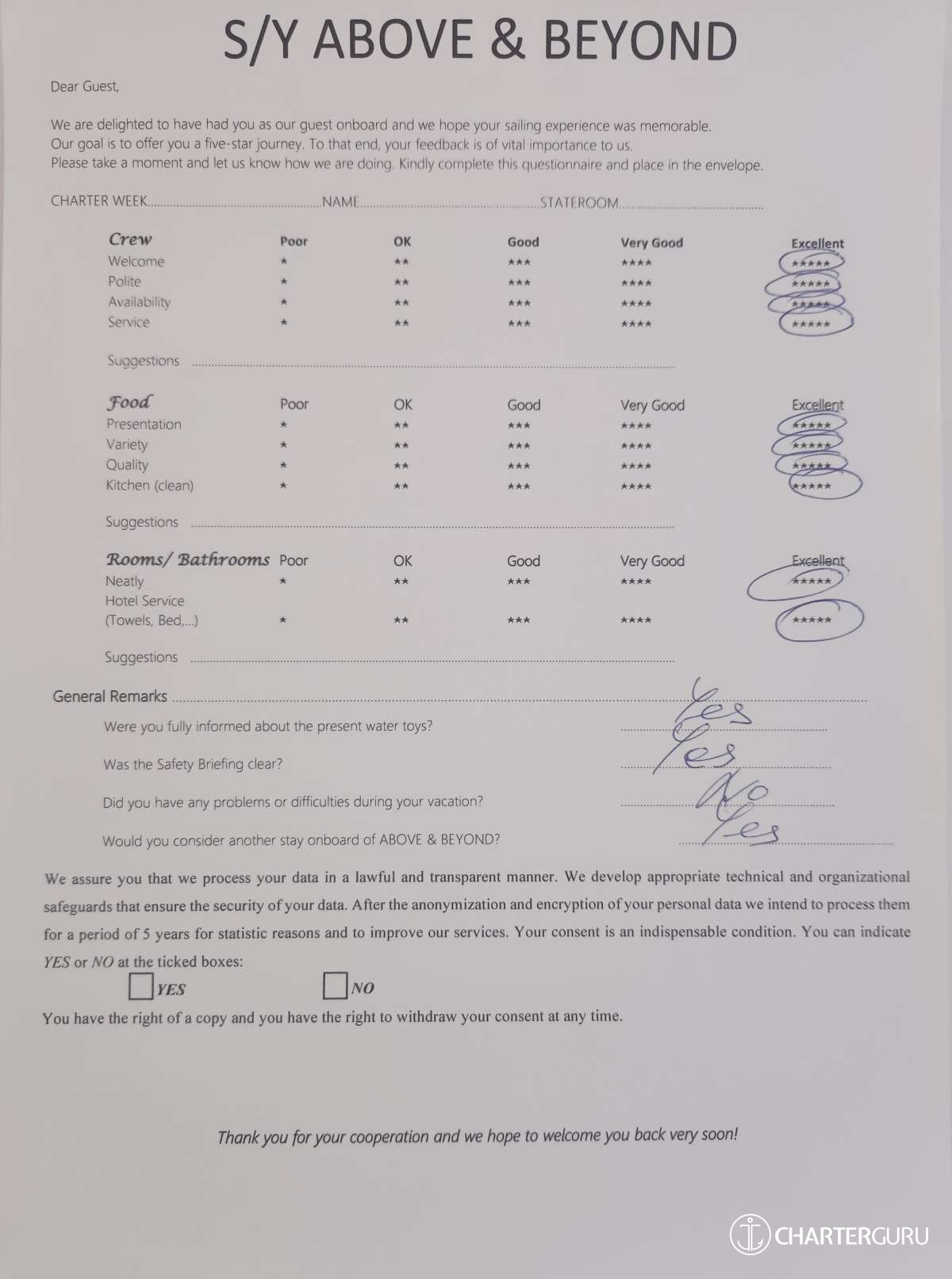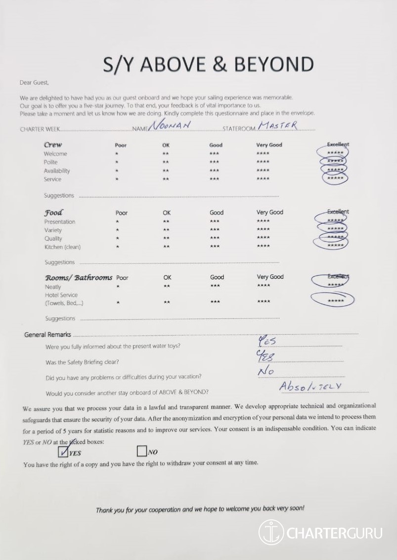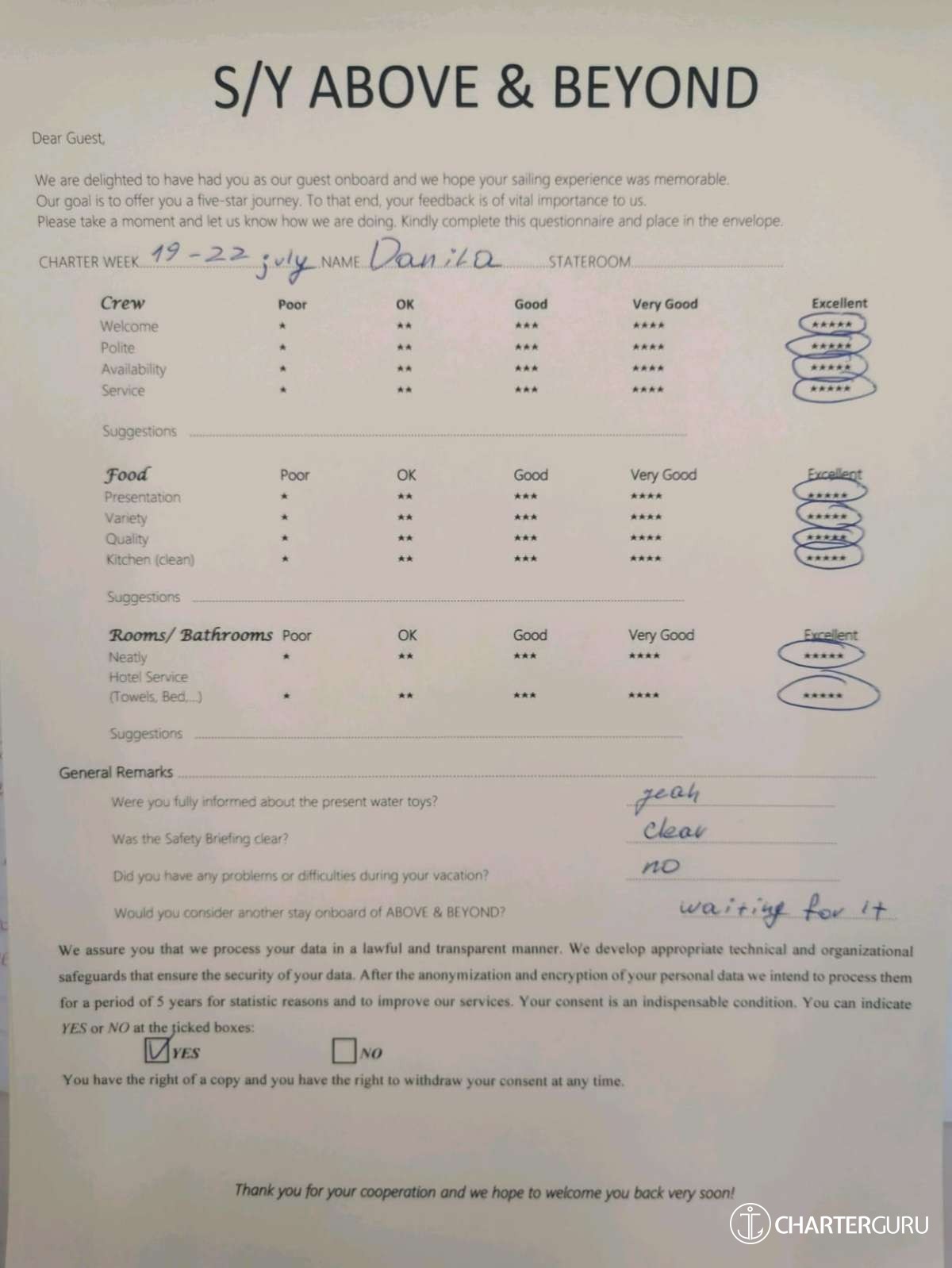 For a sailing catamaran like ABOVE & BEYOND, the expected APA is 20% to 35% of the charter price (€11,000 - €19,250), making the charter cost €66,000 to €74,250. Exact amount will be confirmed after inquiry.