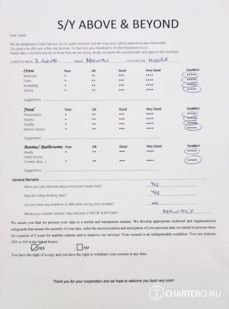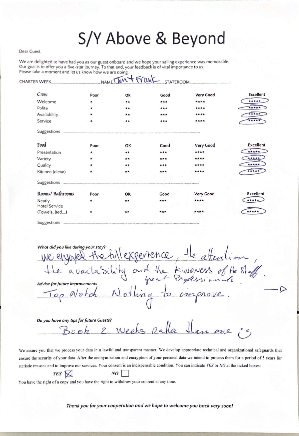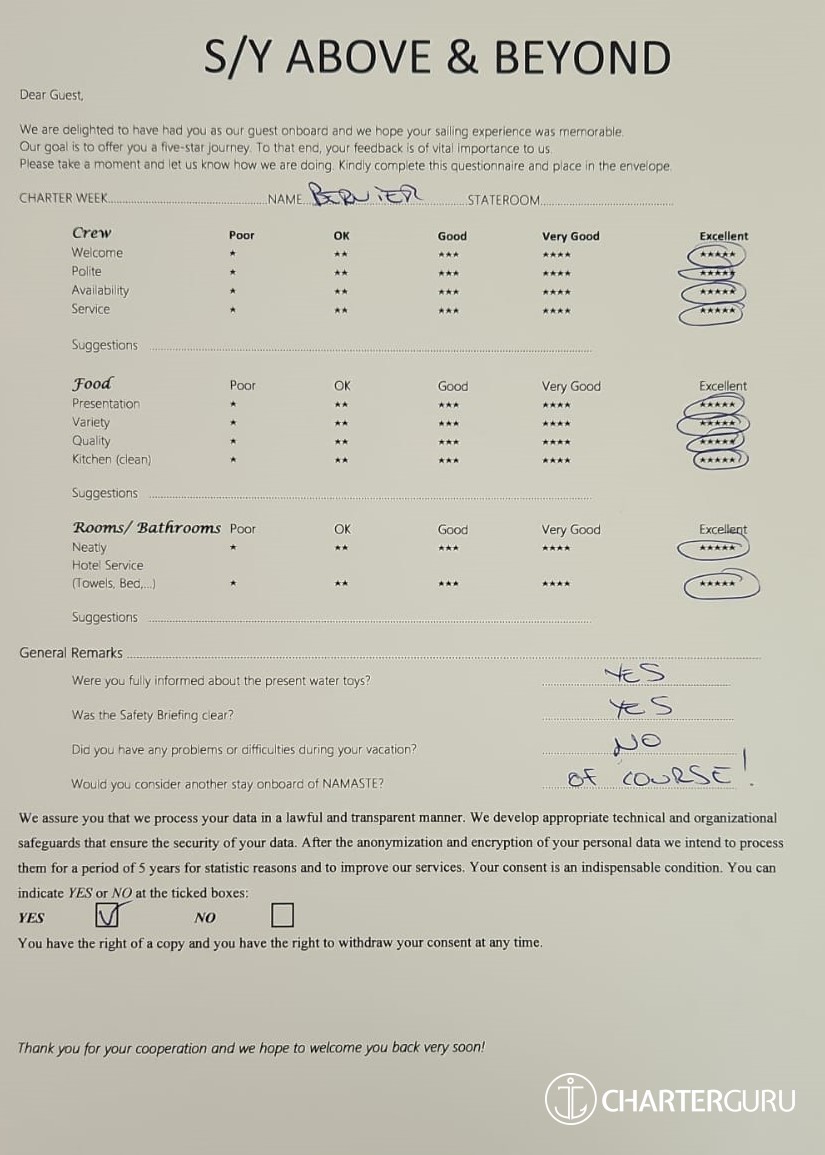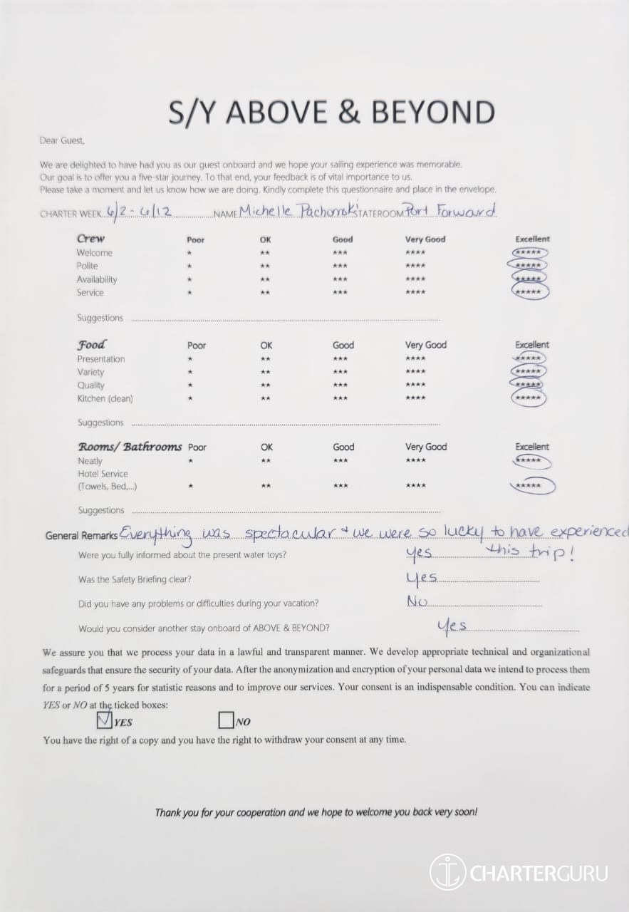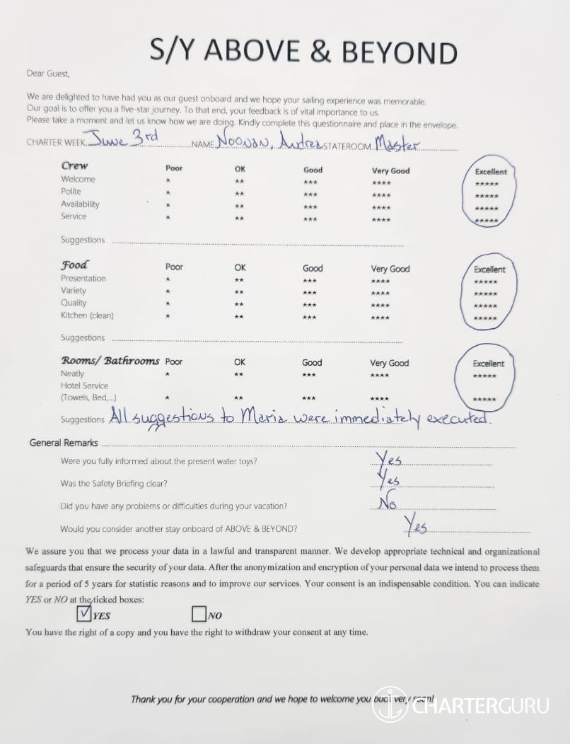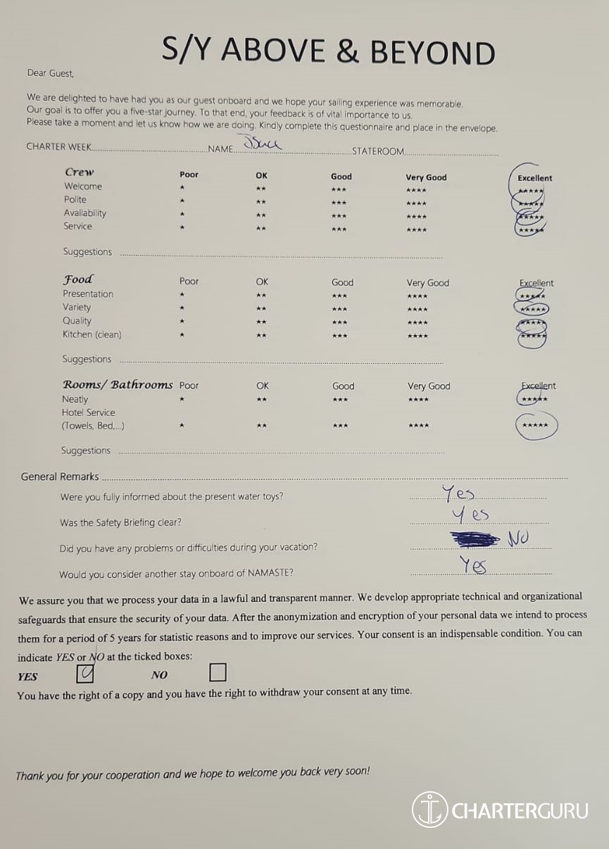 For a sailing catamaran like ABOVE & BEYOND, the expected APA is 20% to 35% of the charter price (€11,000 - €19,250), making the charter cost €66,000 to €74,250. Exact amount will be confirmed after inquiry.