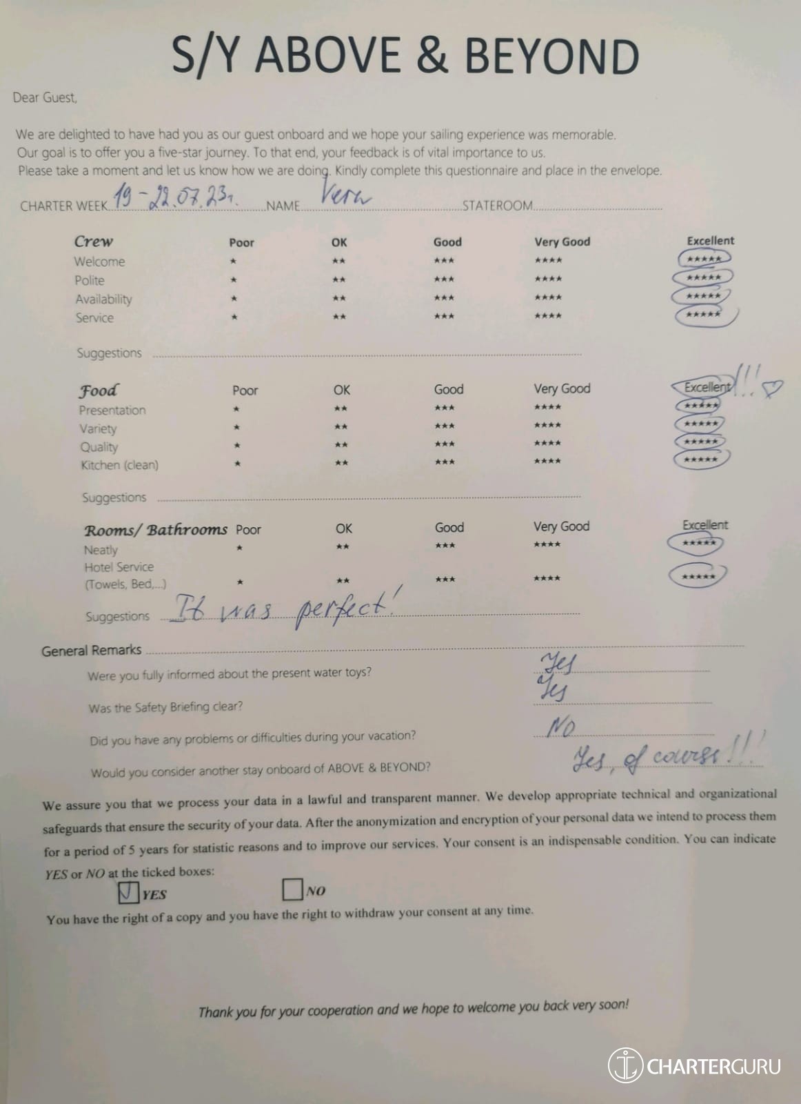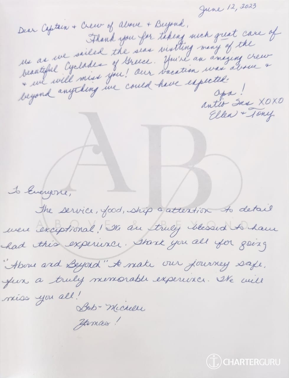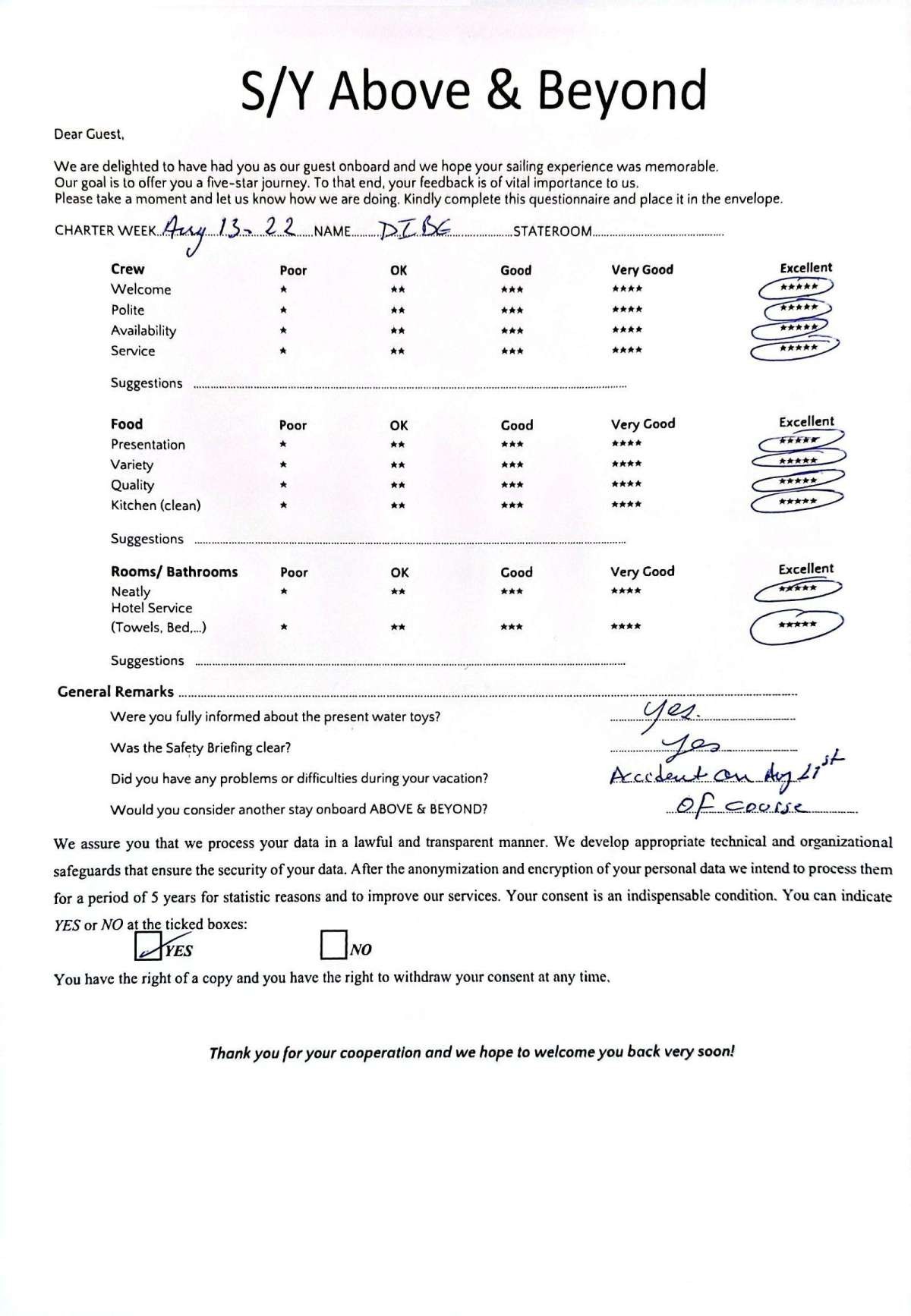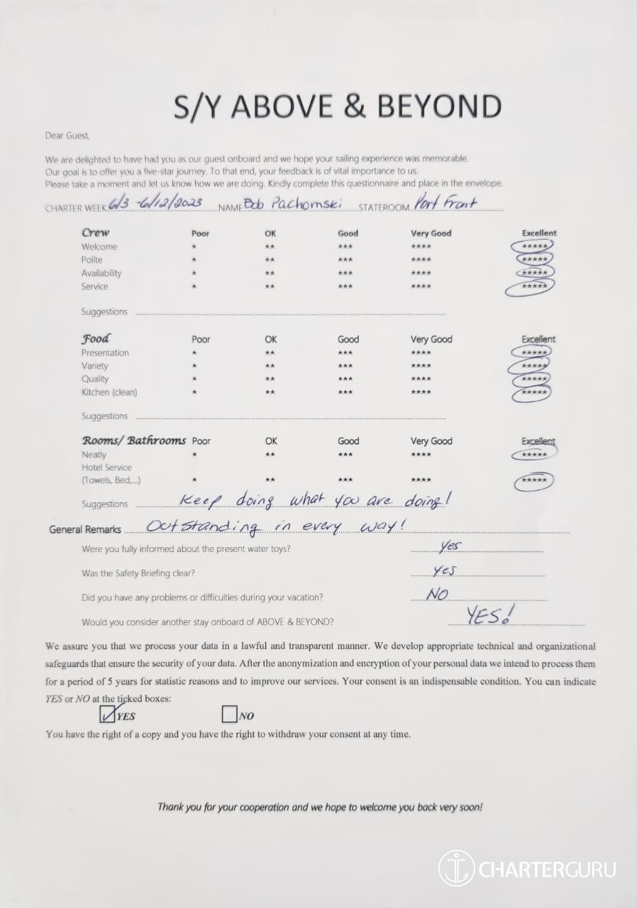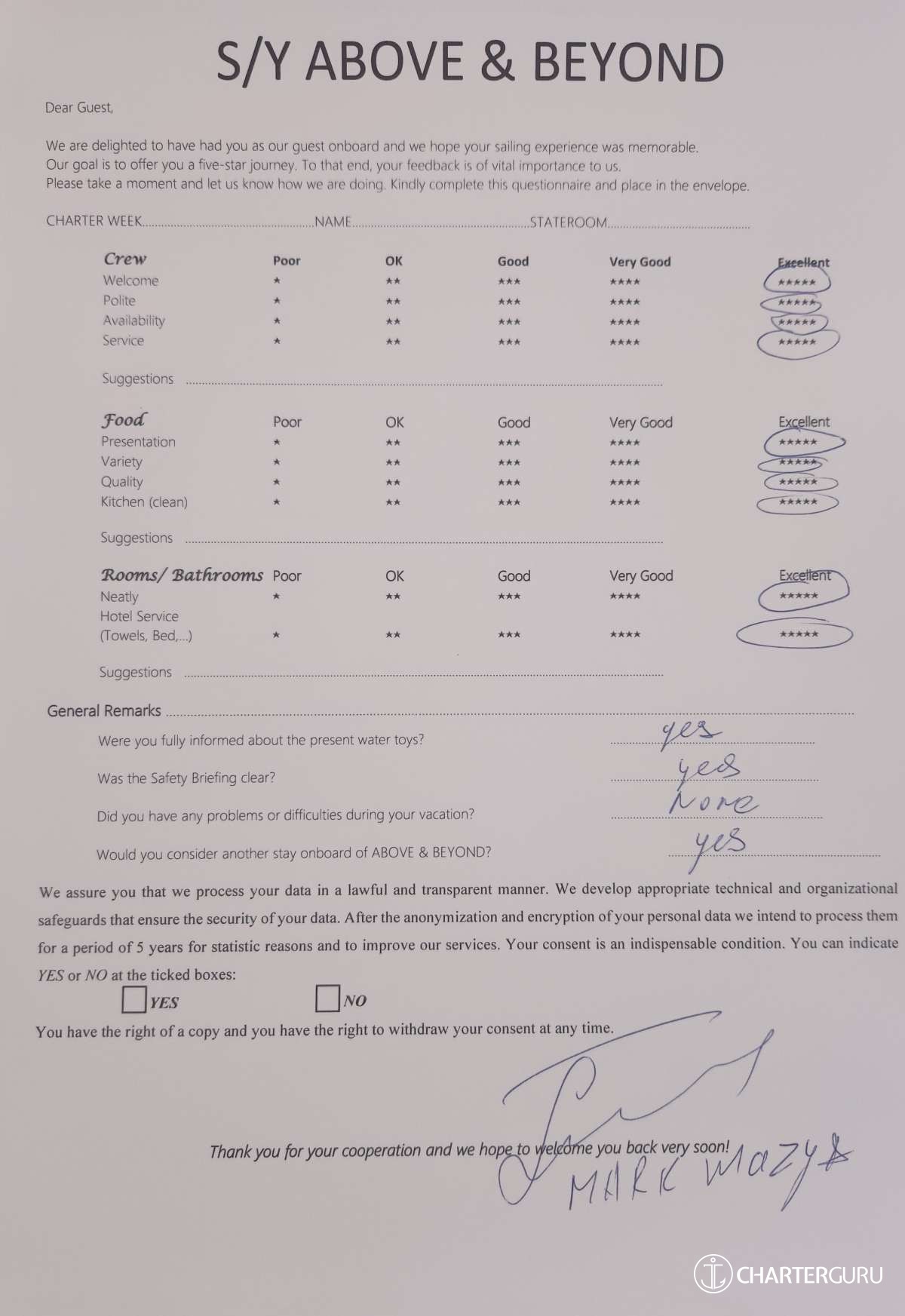 For a sailing catamaran like ABOVE & BEYOND, the expected APA is 20% to 35% of the charter price (€11,000 - €19,250), making the charter cost €66,000 to €74,250. Exact amount will be confirmed after inquiry.