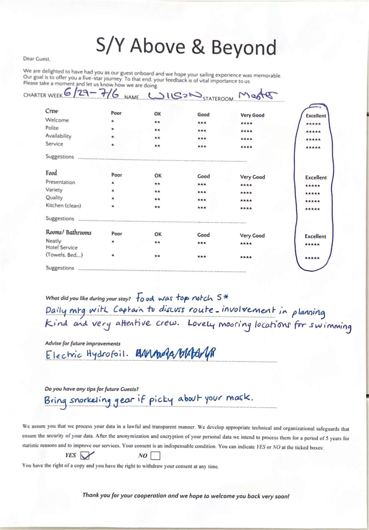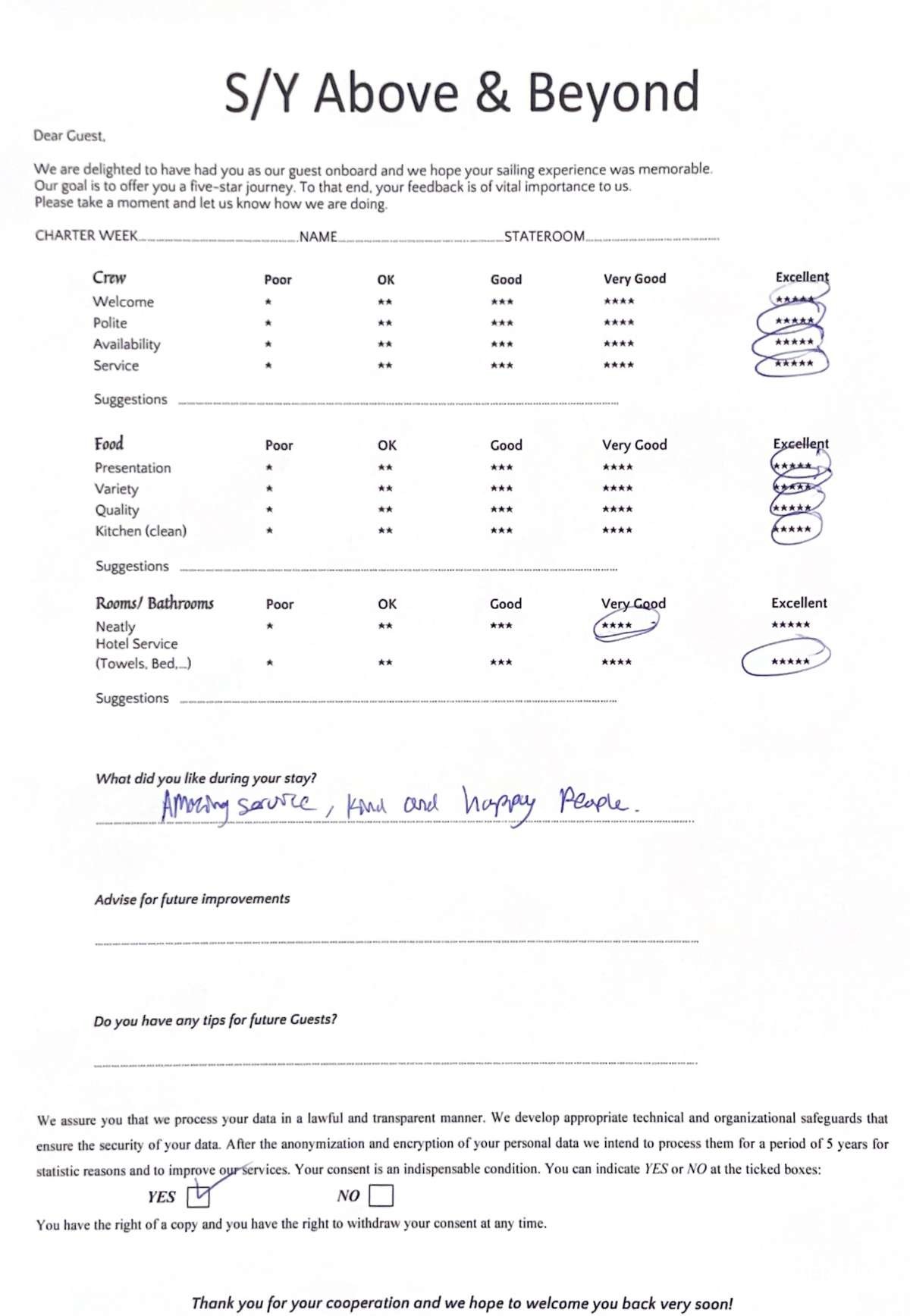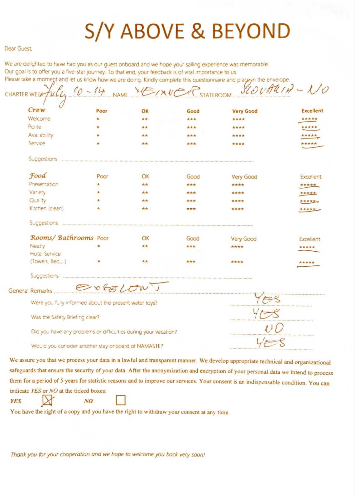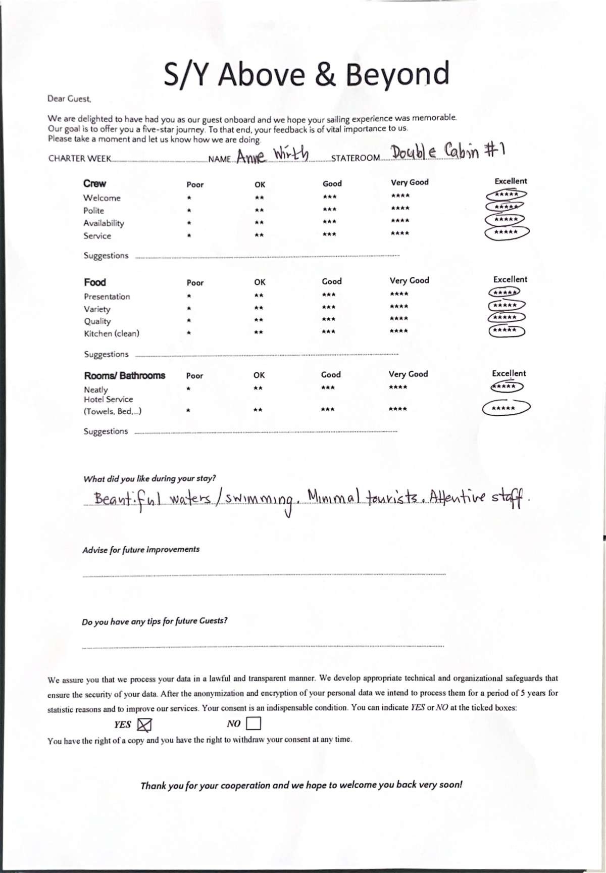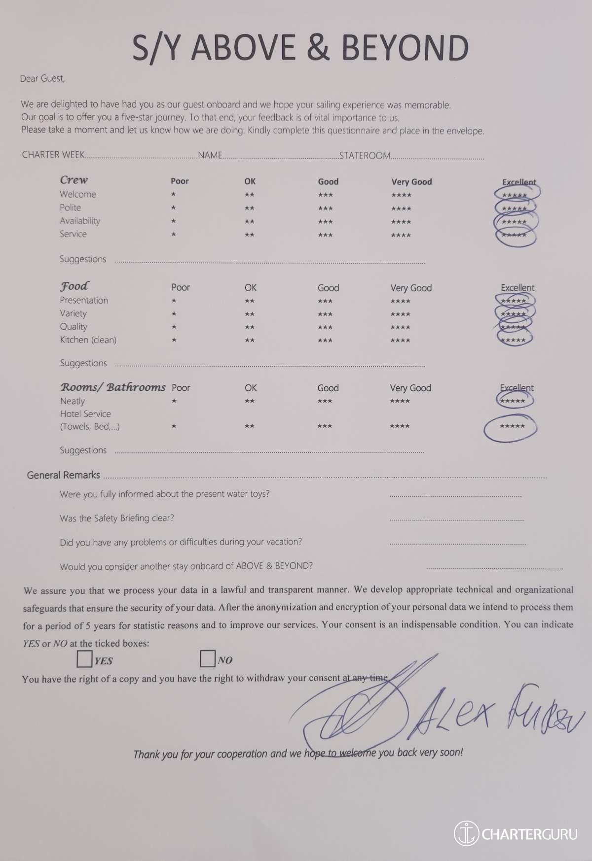 For a sailing catamaran like ABOVE & BEYOND, the expected APA is 20% to 35% of the charter price (€11,000 - €19,250), making the charter cost €66,000 to €74,250. Exact amount will be confirmed after inquiry.