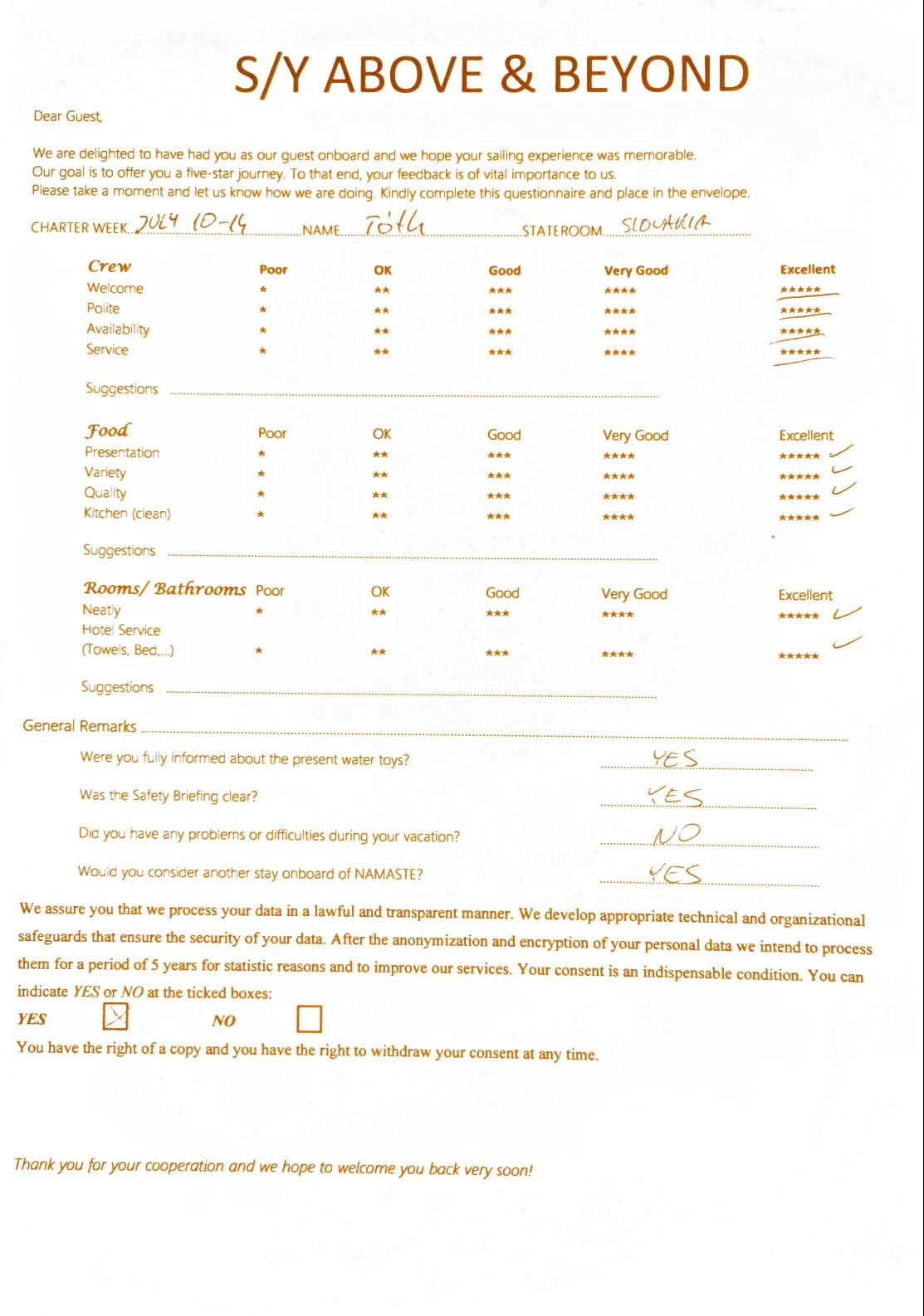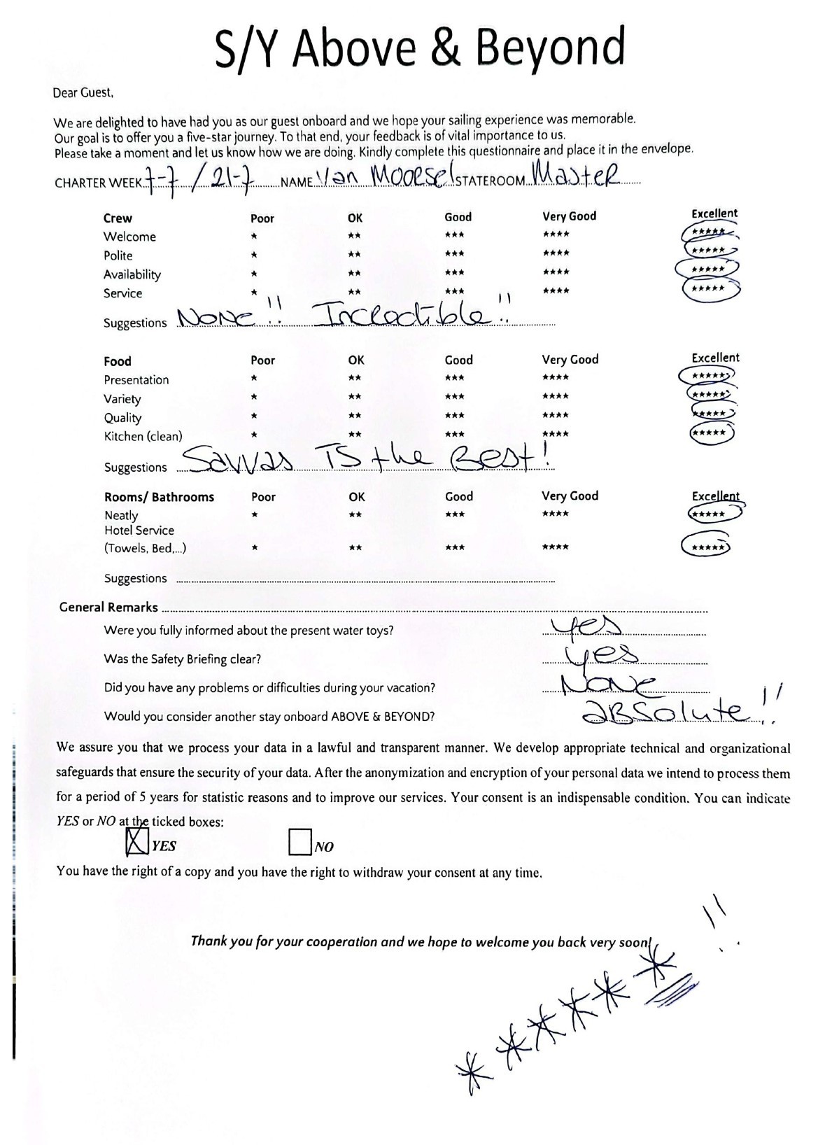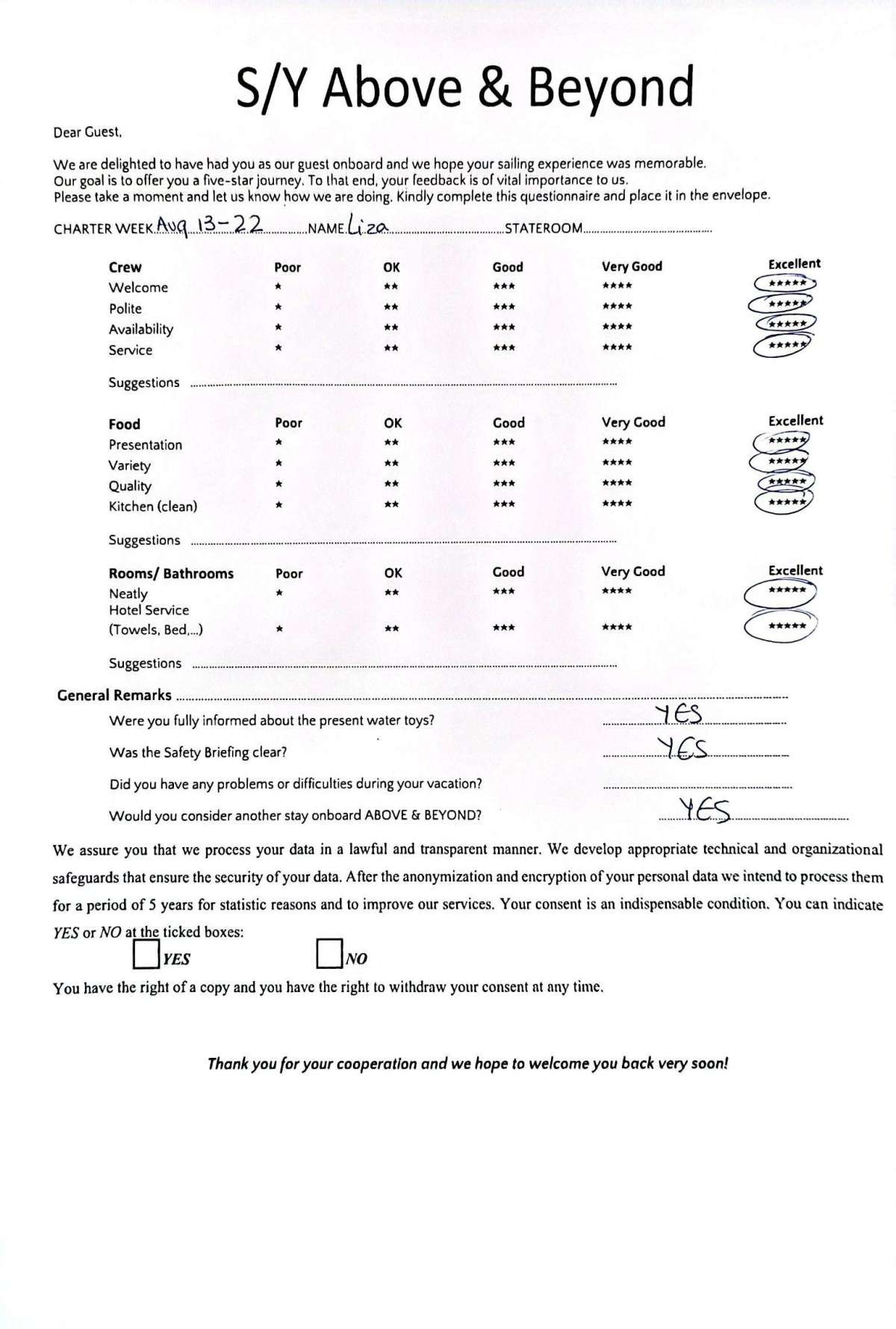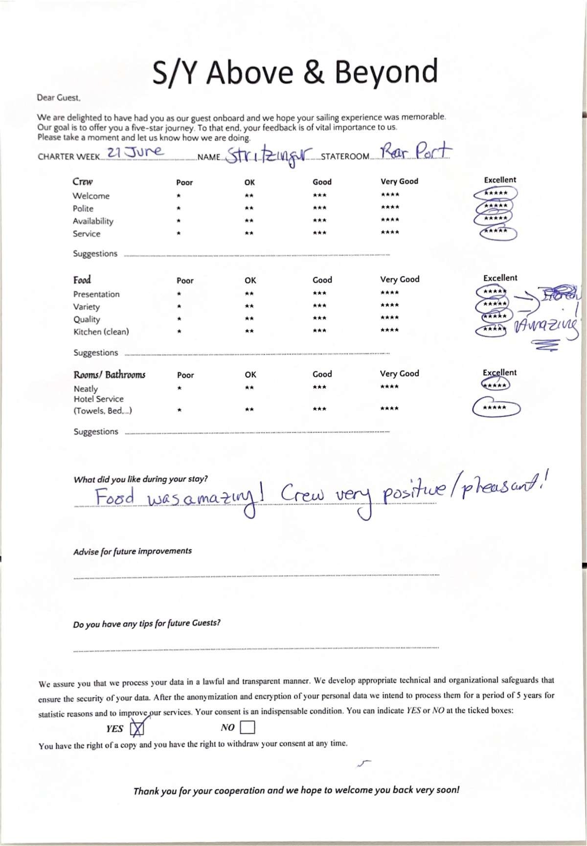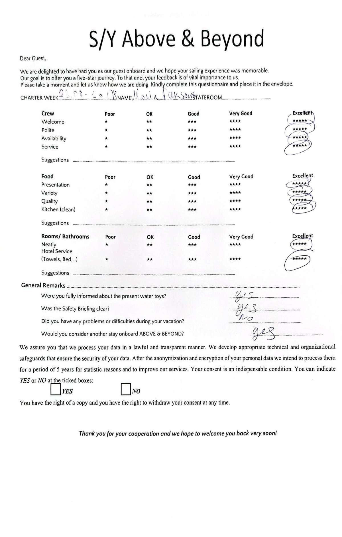 For a sailing catamaran like ABOVE & BEYOND, the expected APA is 20% to 35% of the charter price (€11,000 - €19,250), making the charter cost €66,000 to €74,250. Exact amount will be confirmed after inquiry.