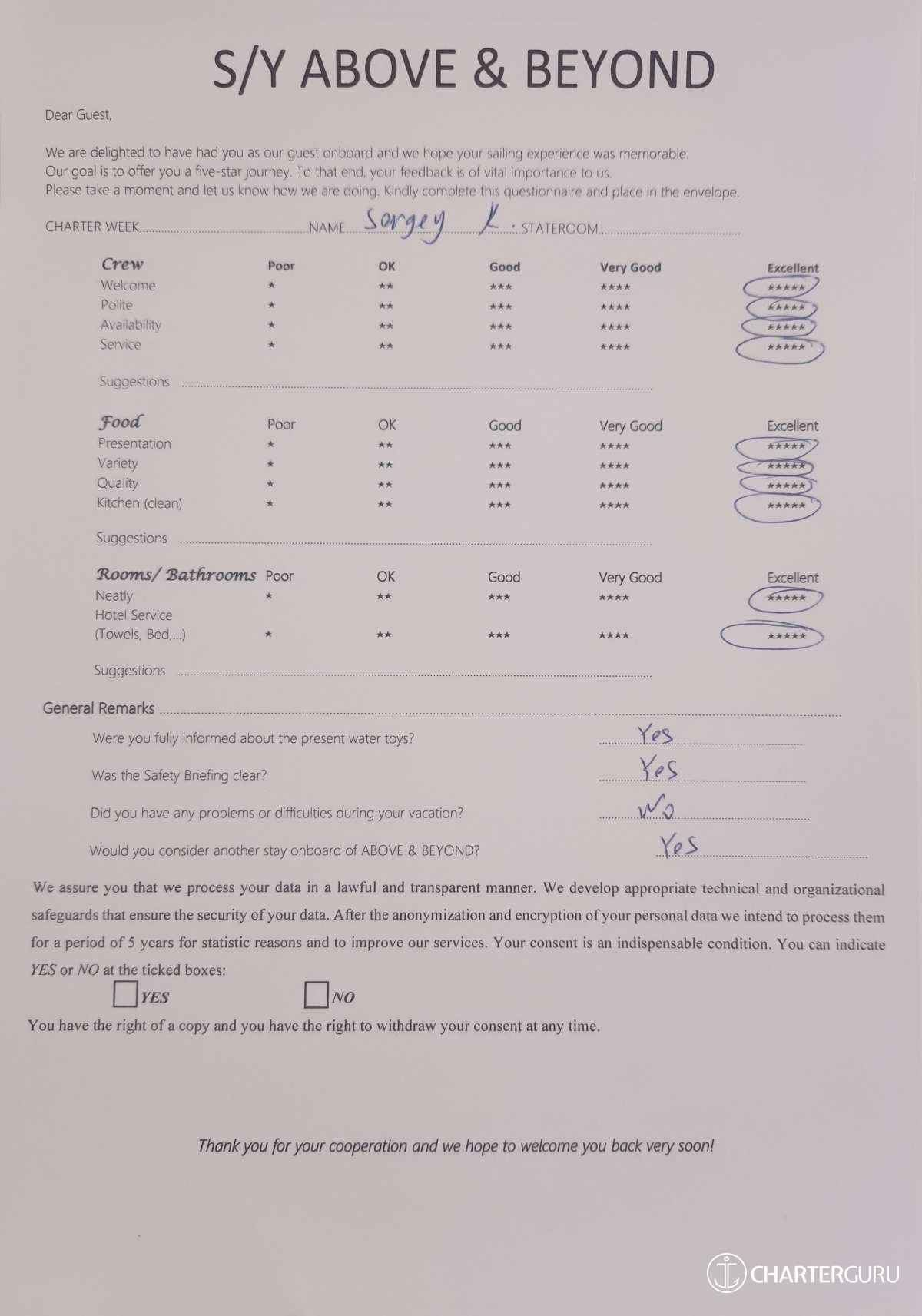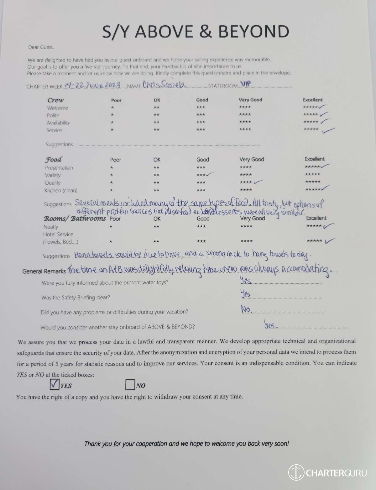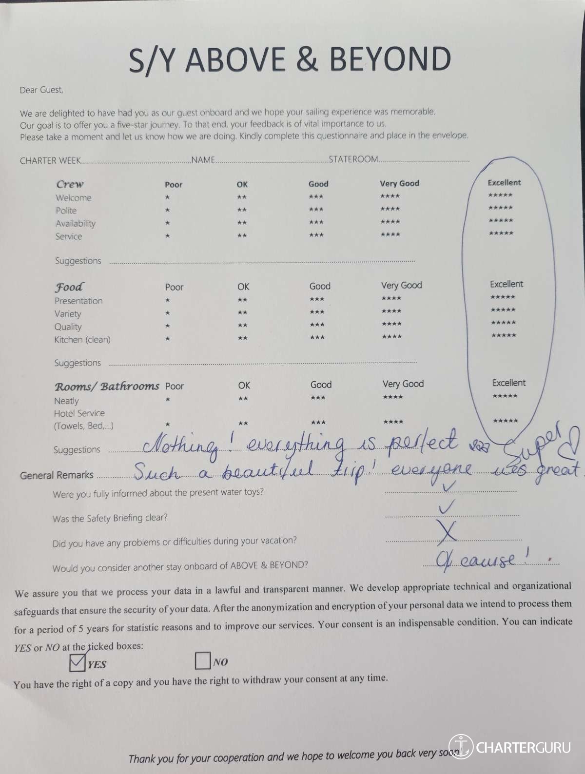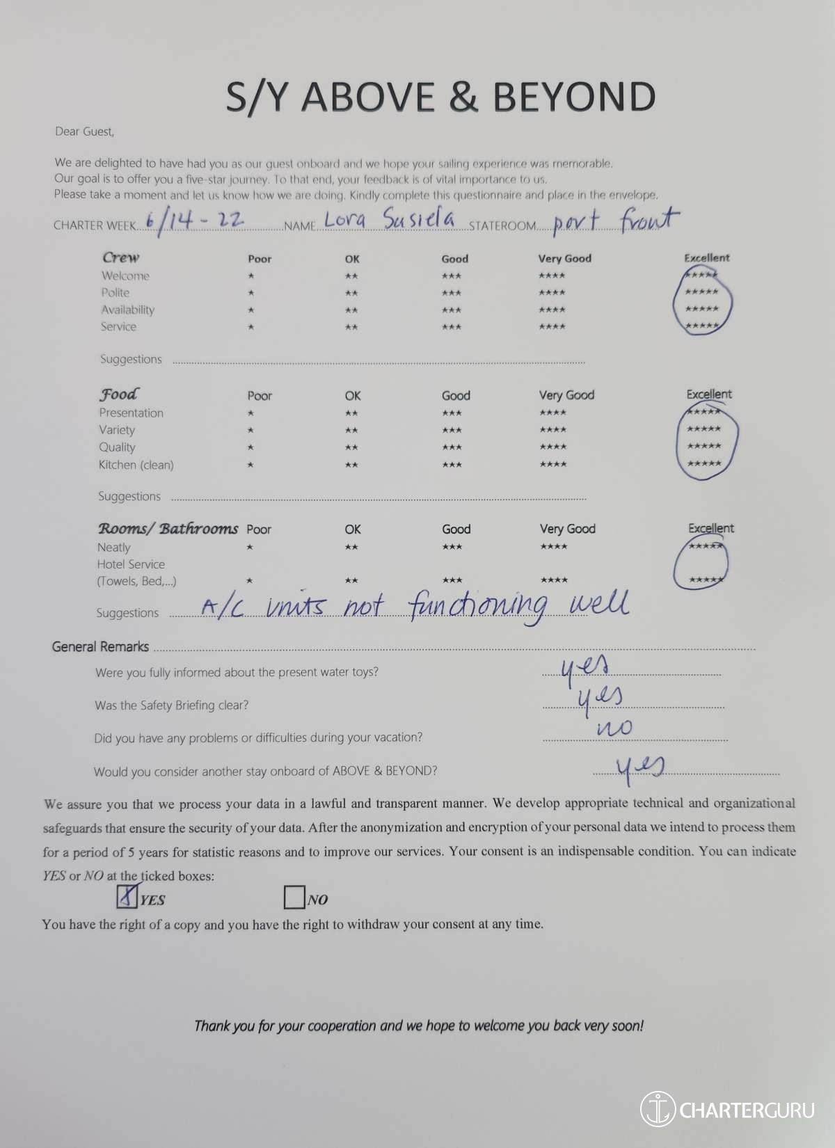 One master cabin and three queen guest cabins all with TV and private bathroomsWhat is the cabin arrangement of ABOVE & BEYOND?
