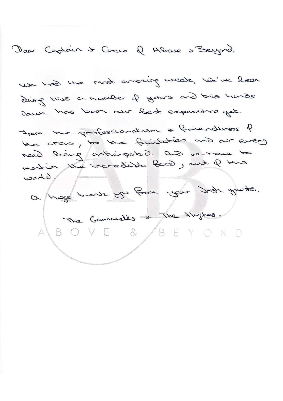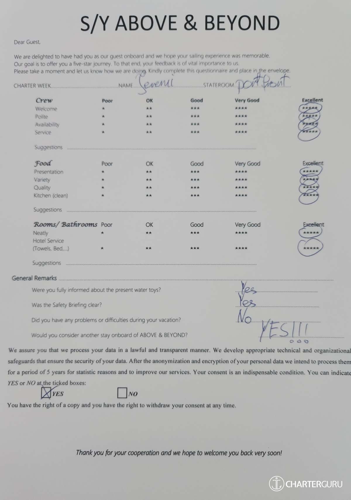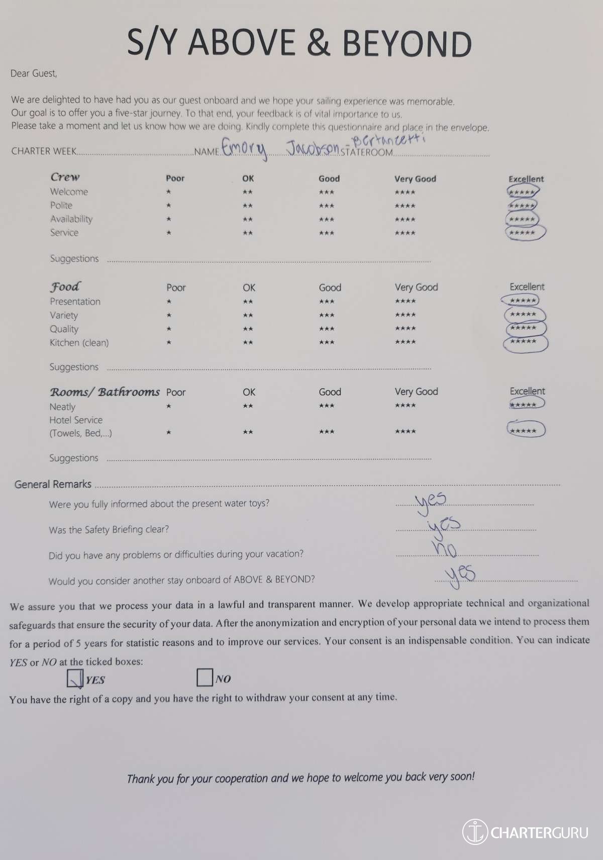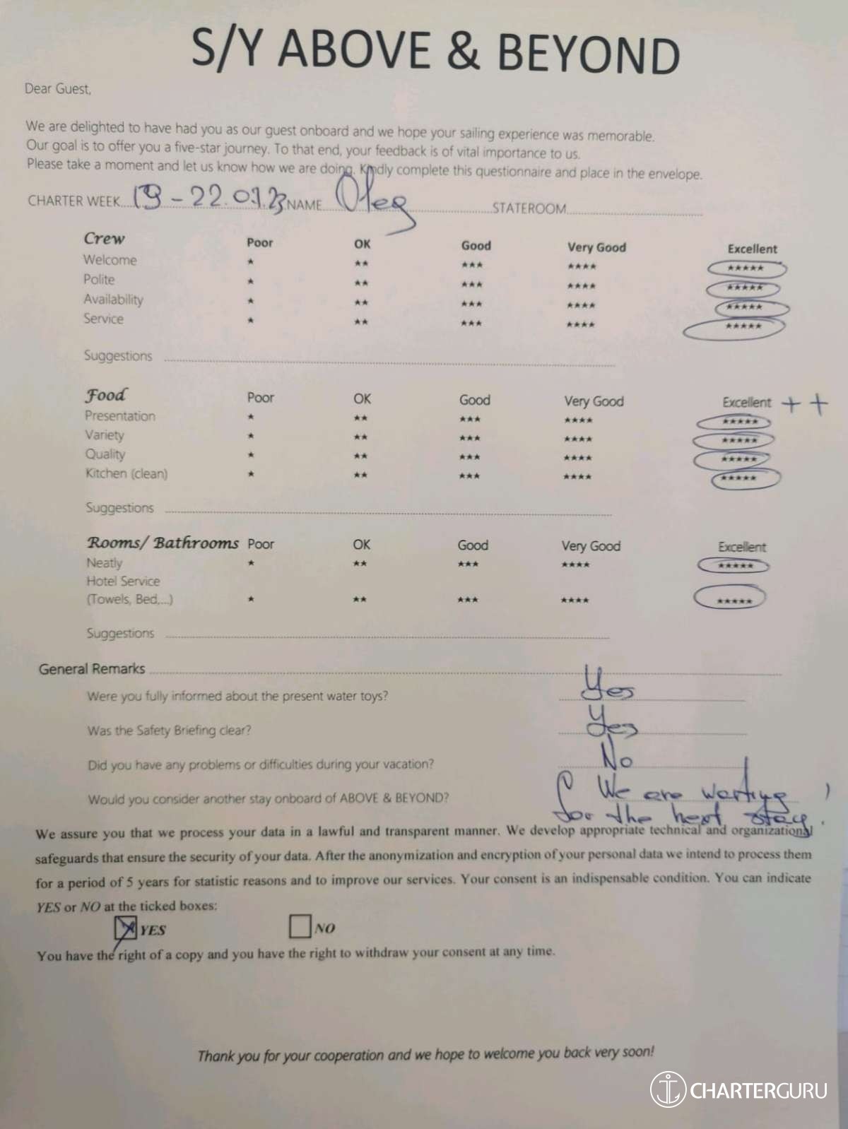 One master cabin and three queen guest cabins all with TV and private bathroomsWhat is the cabin arrangement of ABOVE & BEYOND?