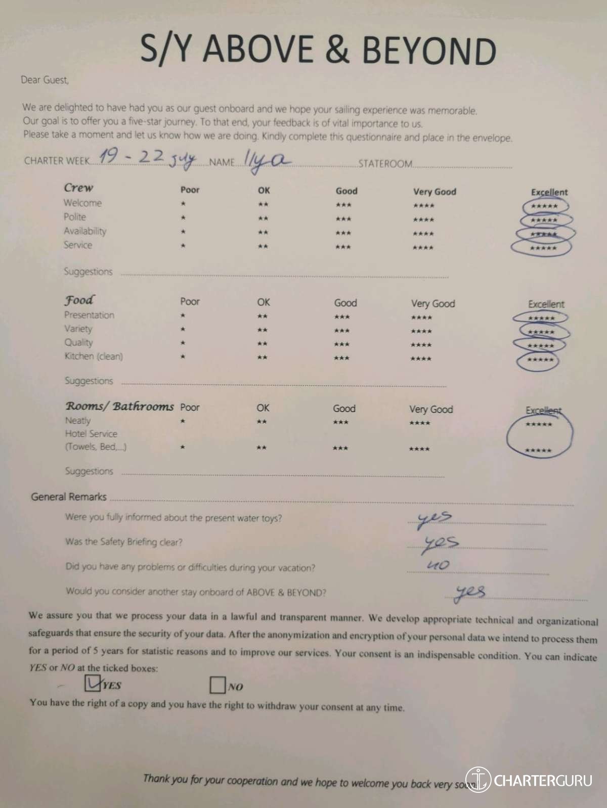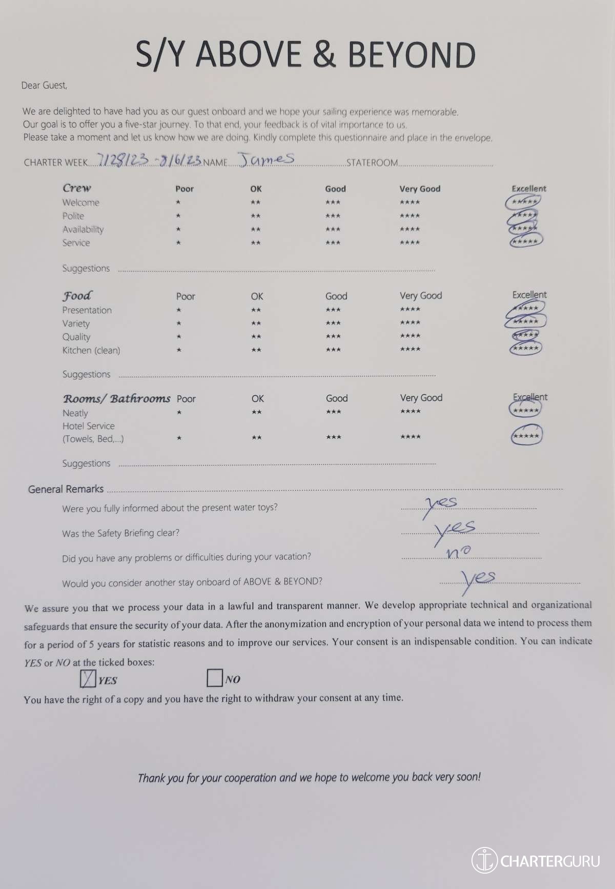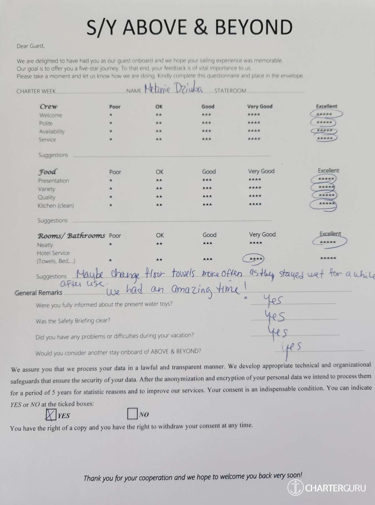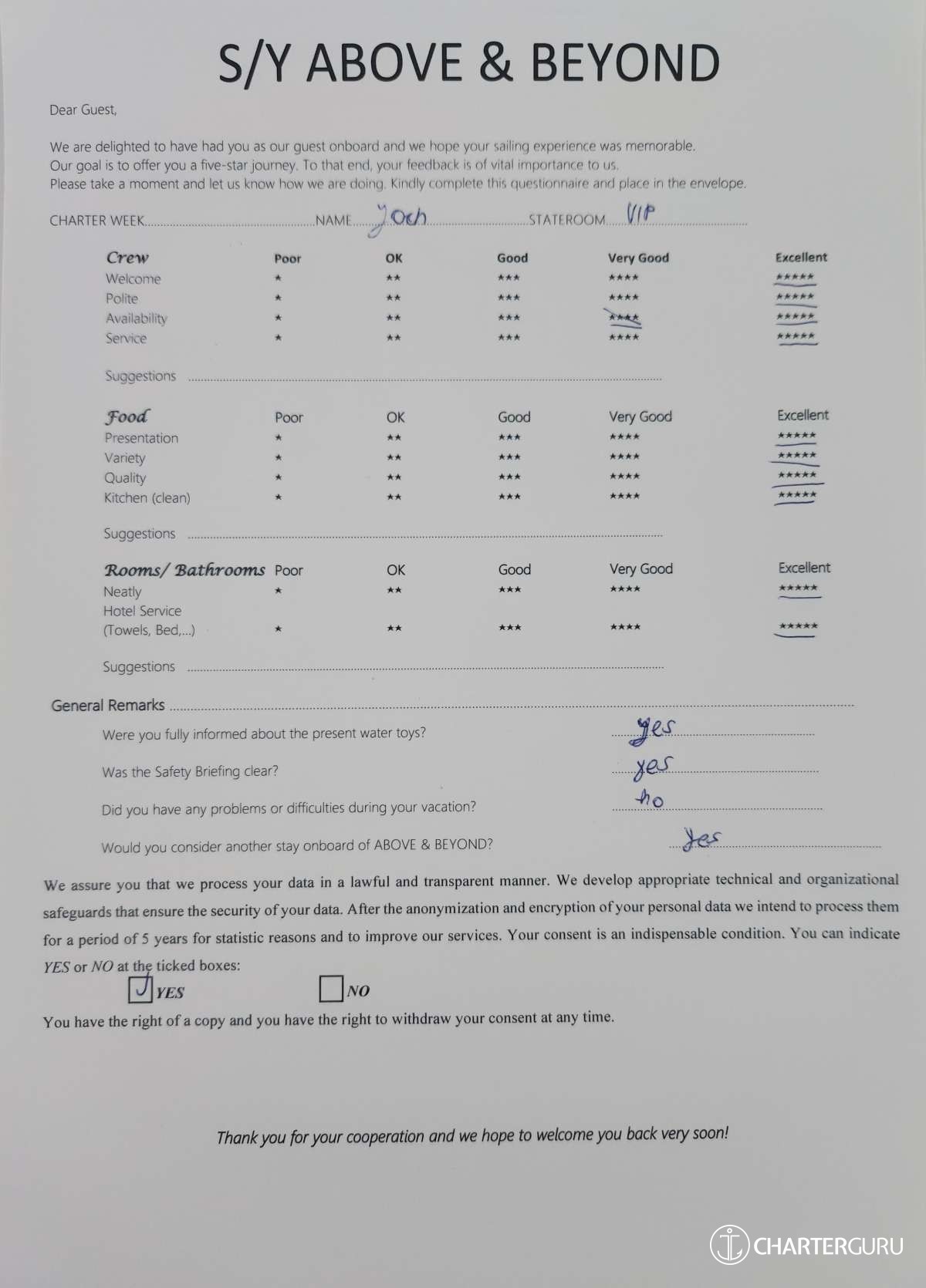 One master cabin and three queen guest cabins all with TV and private bathroomsWhat is the cabin arrangement of ABOVE & BEYOND?