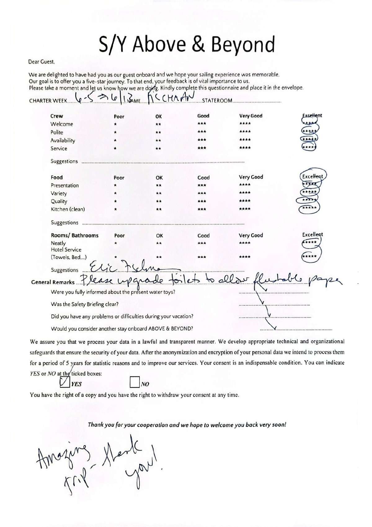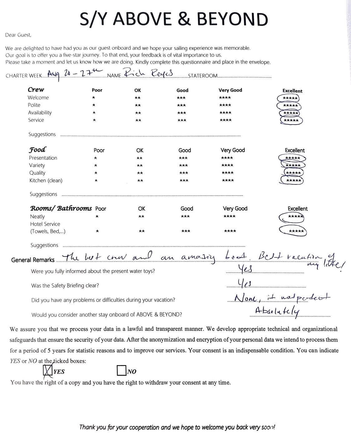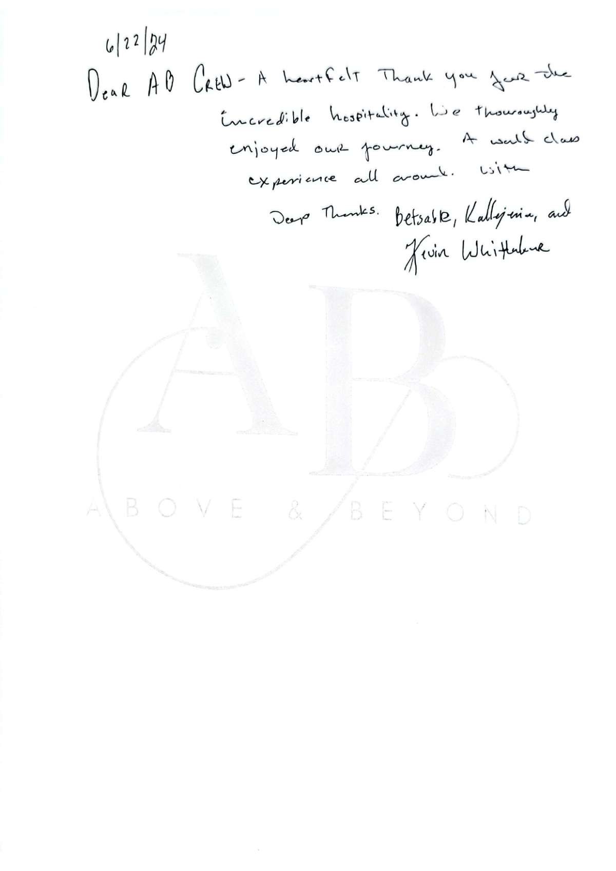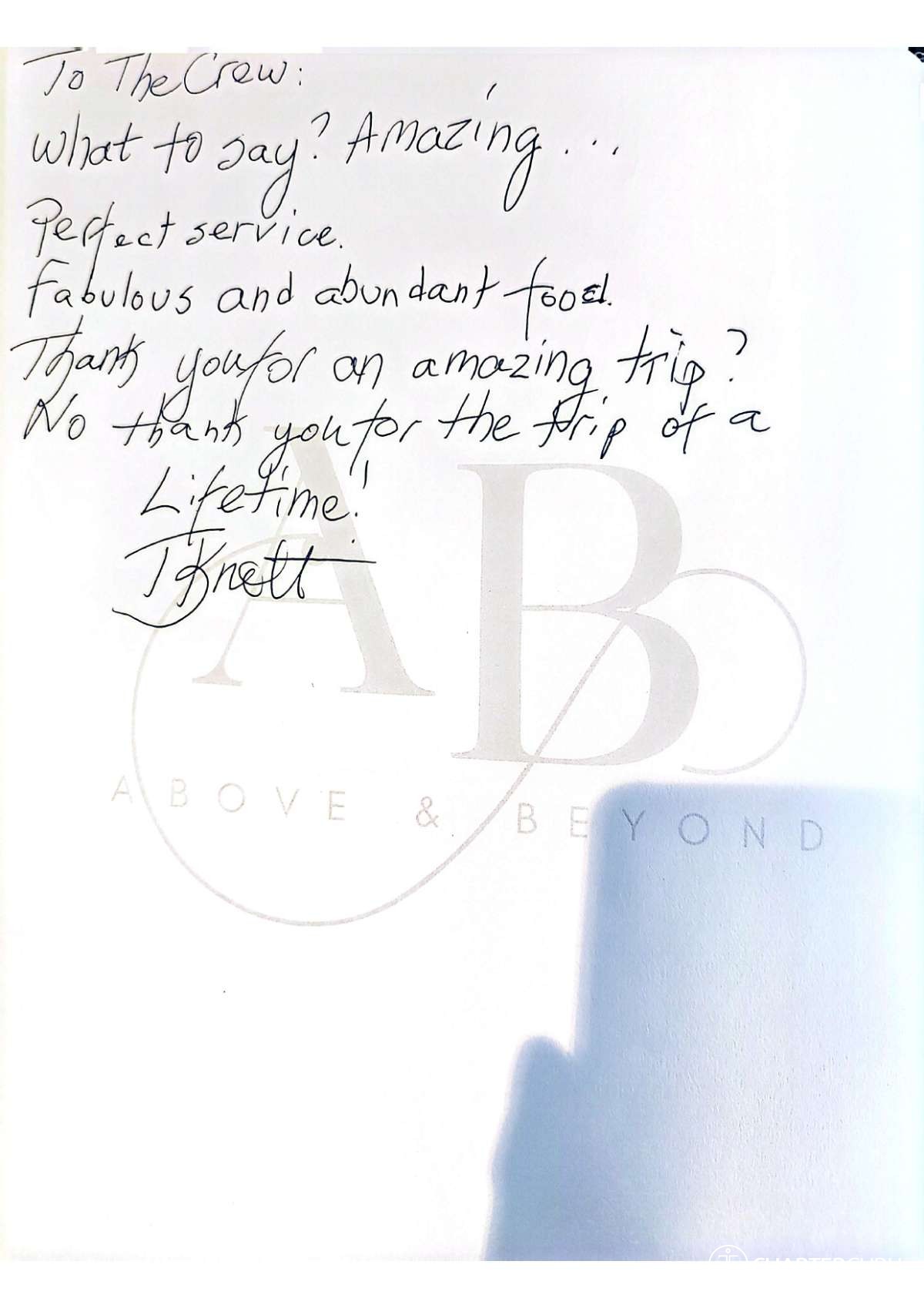 One master cabin and three queen guest cabins all with TV and private bathroomsWhat is the cabin arrangement of ABOVE & BEYOND?