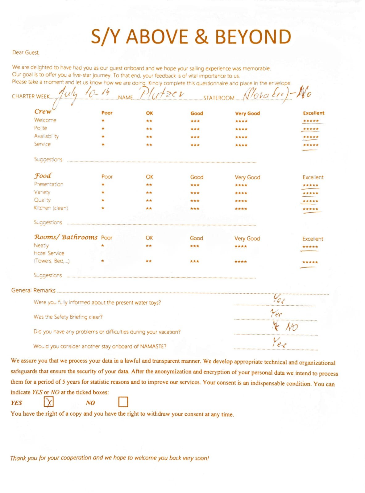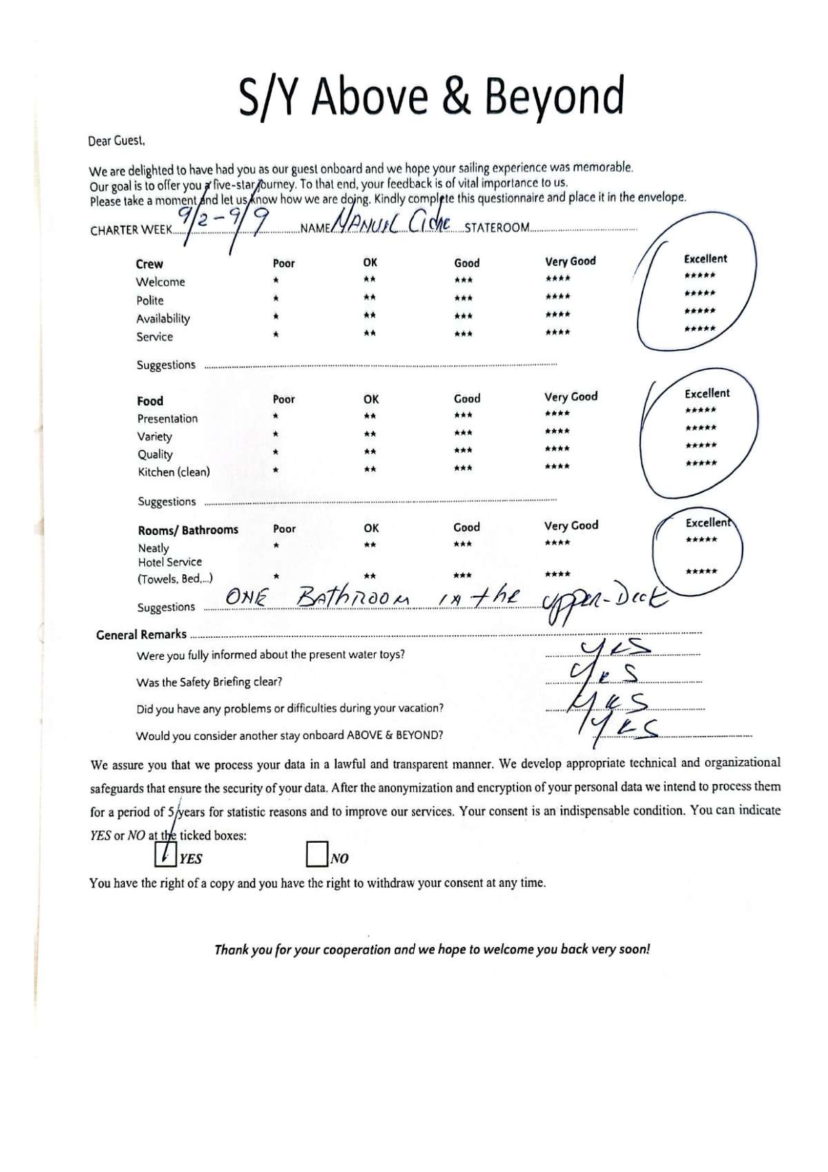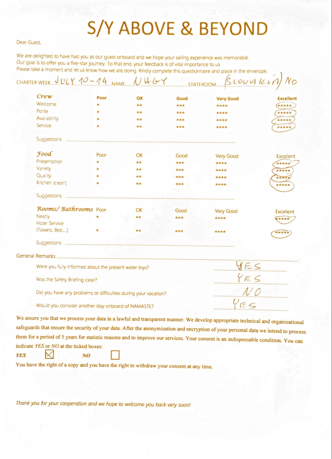 The expenses, such as provisioning, fuel, marina fees, are deducted from the APA. The APA is based on the price of the yacht and ranges from 15% (crewed sailing yachts) to 30% (motor yachts with higher fuel consumption).