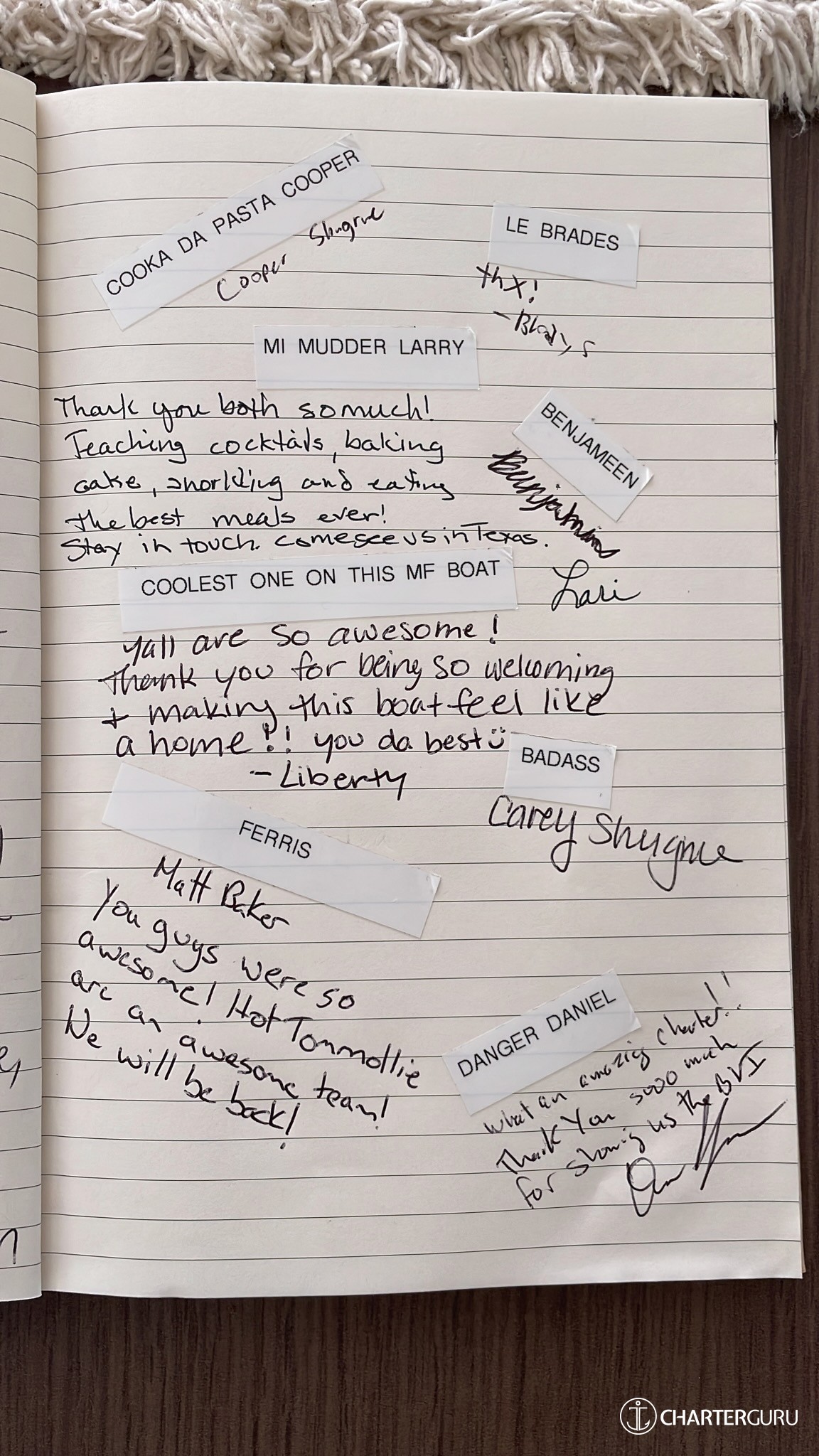 Thank you so much for all you have done for us this week! It's a sign of a great tip when by the end we all call our crew our friends. I'm so happy we could introduce your to the Flabongo for the first time! Extra special thank you for taking care of your "difficult passenger" (with all my sea sickness/hangovers/injuries). I wish we could join you for the next 2 weeks, but since we can't, I hope you both have some relaxing down time together. We will see you in Amsterdam!