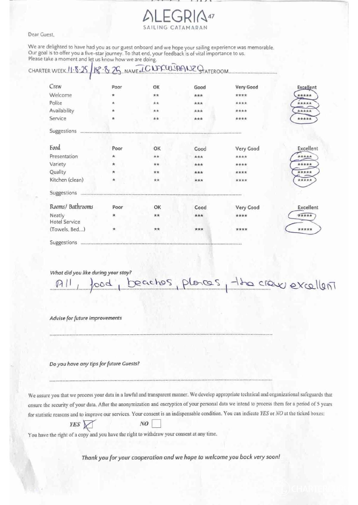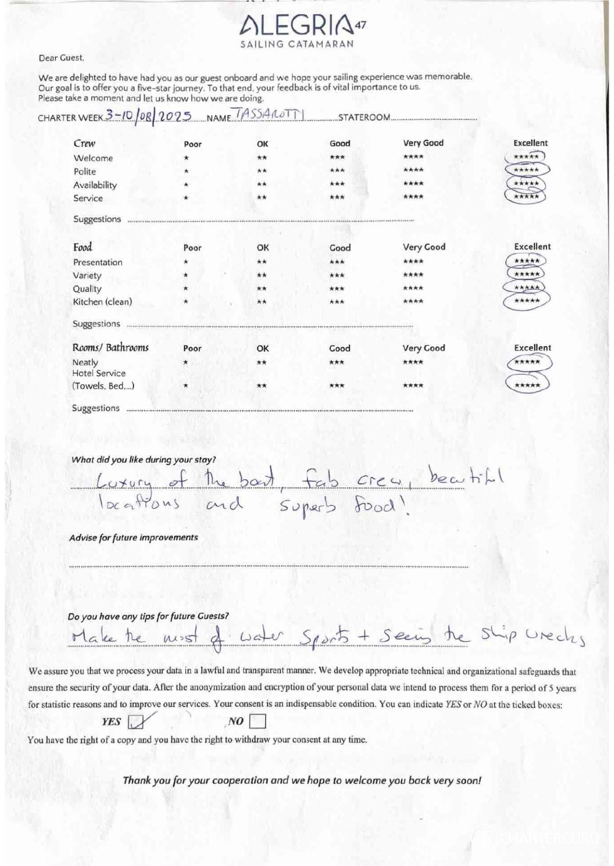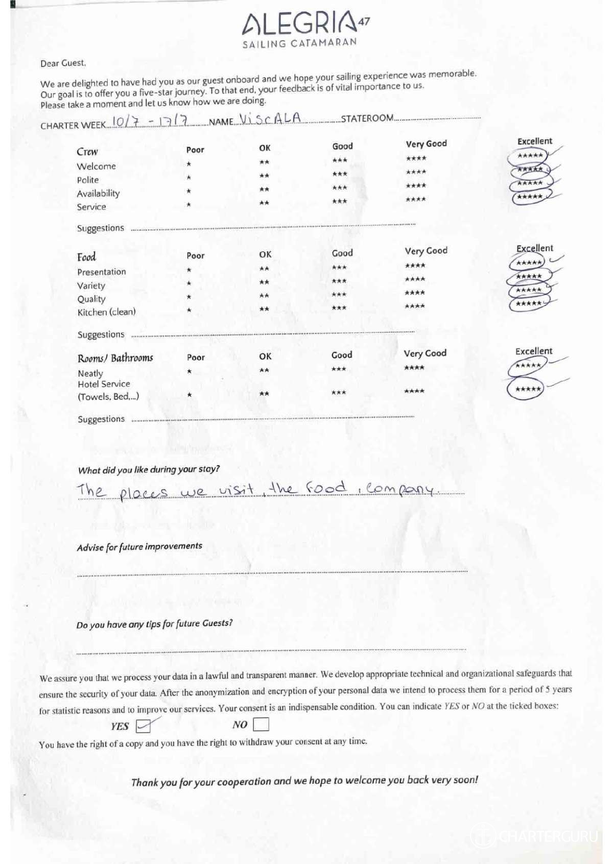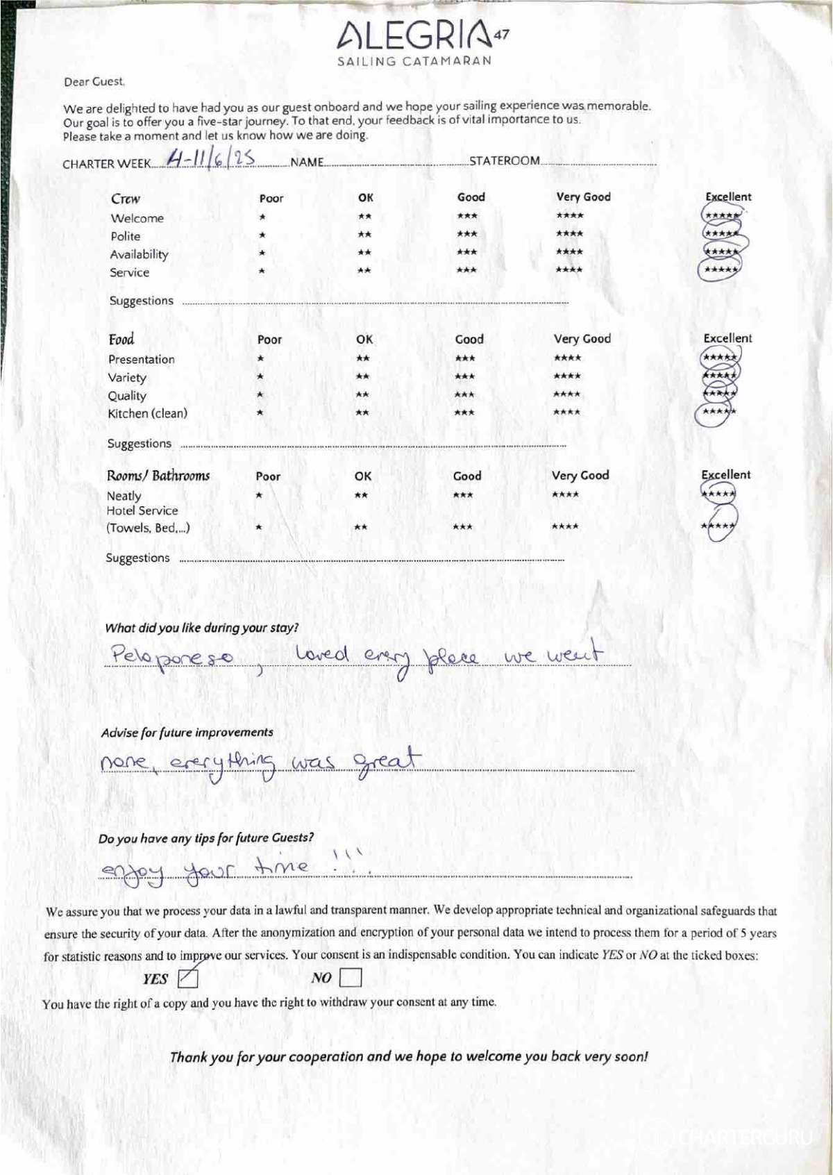 For a sailing catamaran like ALEGRIA, the expected APA is 20% to 35% of the charter price (€2,180 - €3,815), making the charter cost €13,080 to €14,715. Exact amount will be confirmed after inquiry.