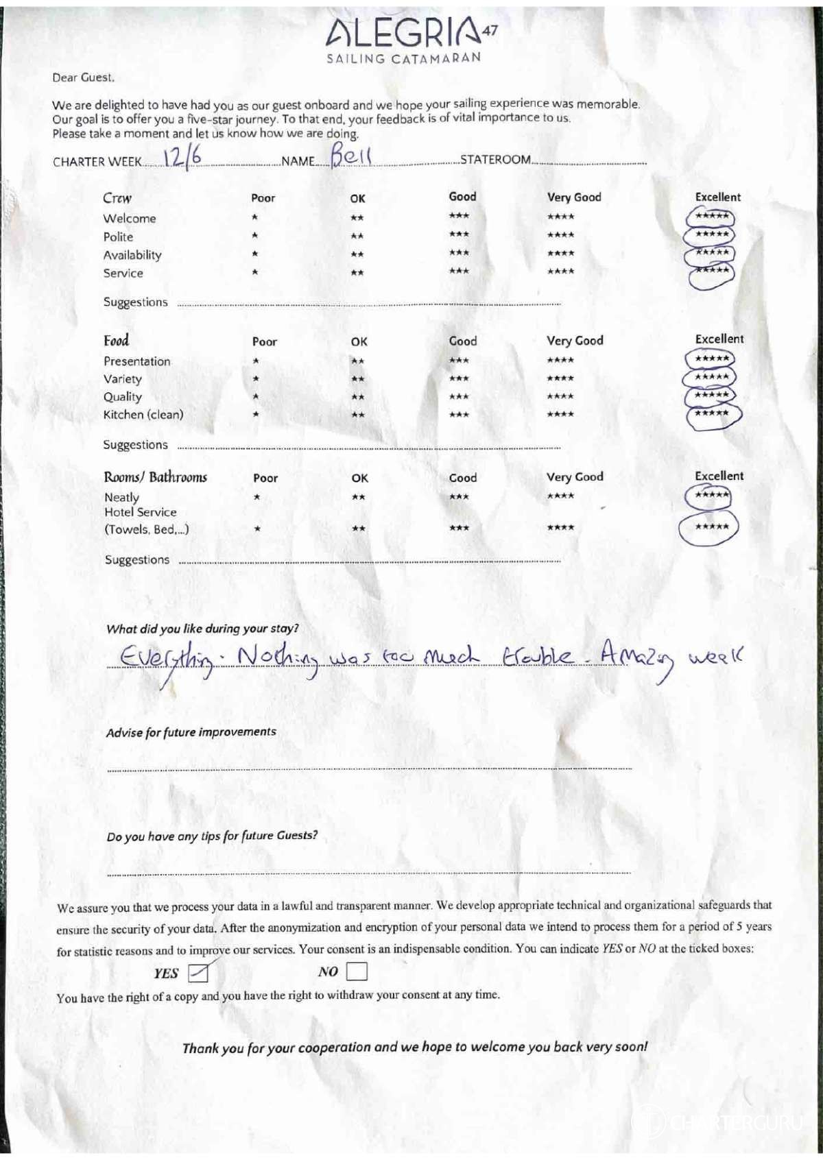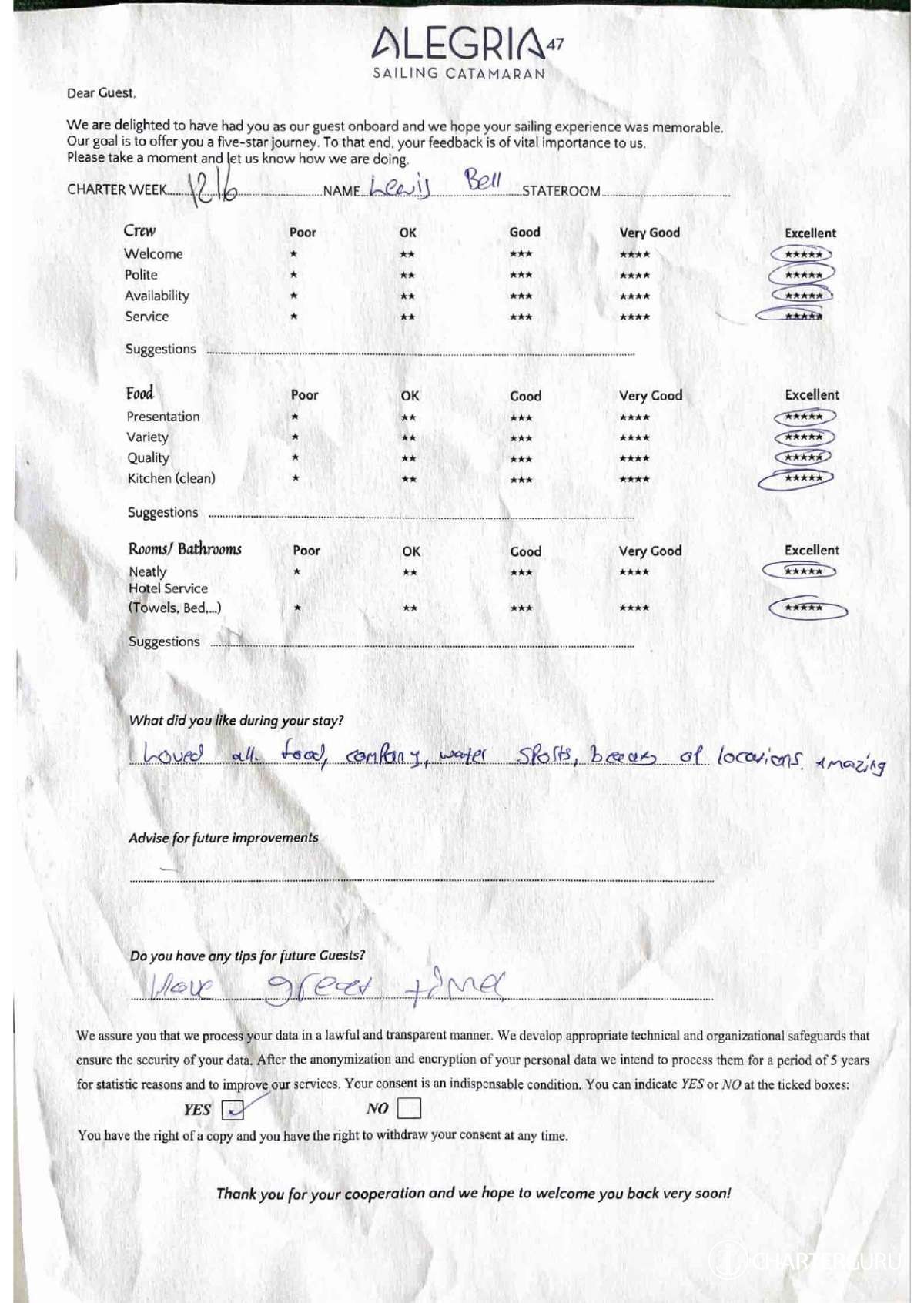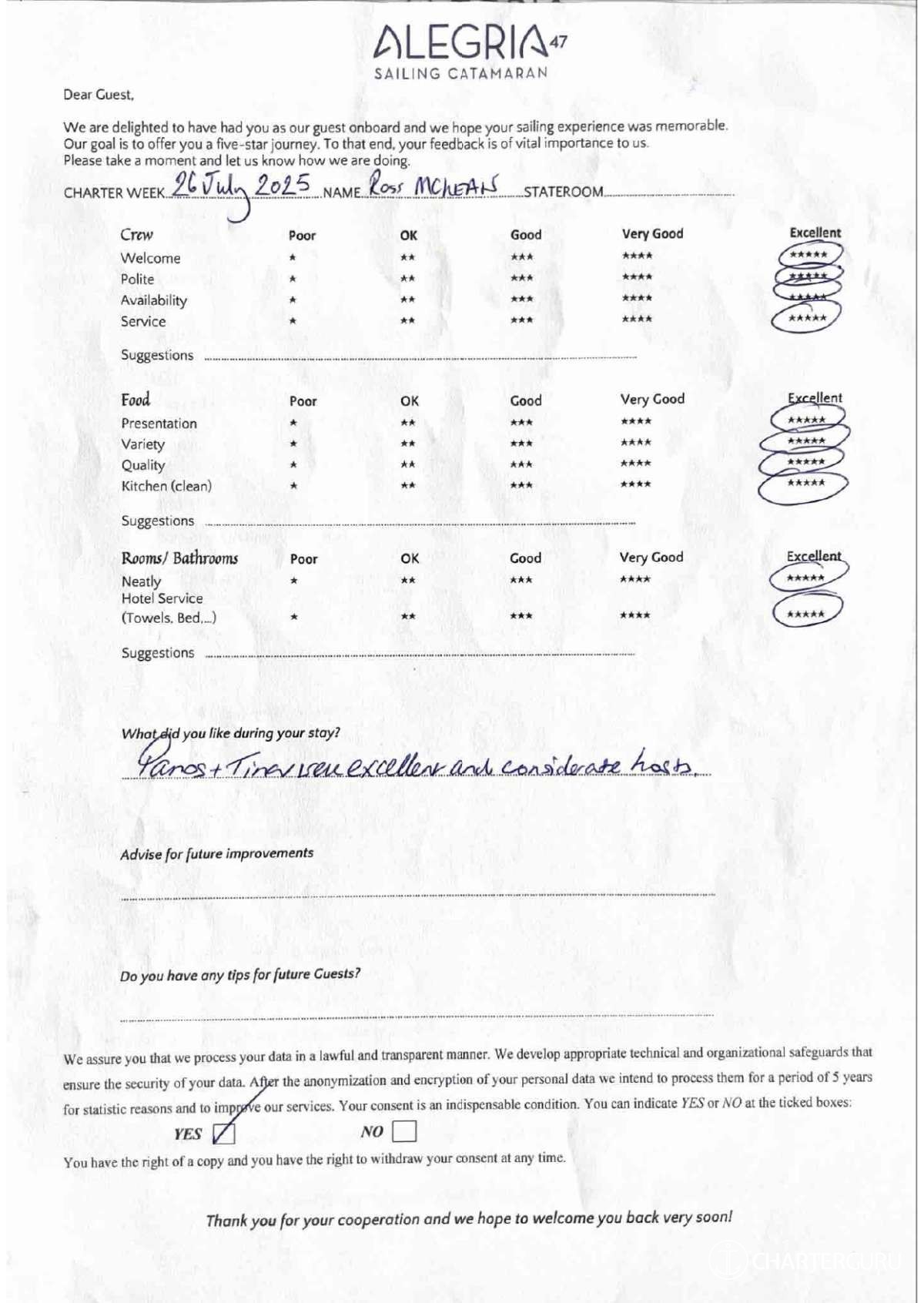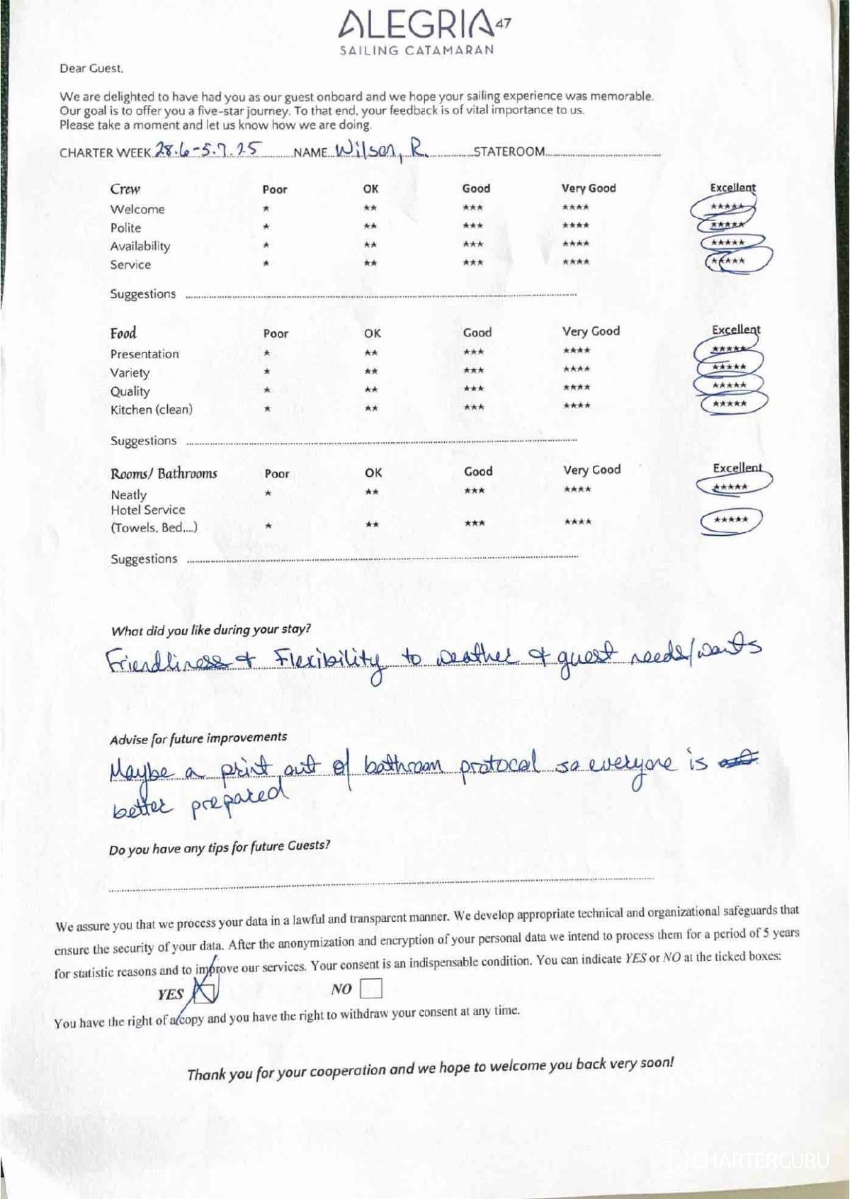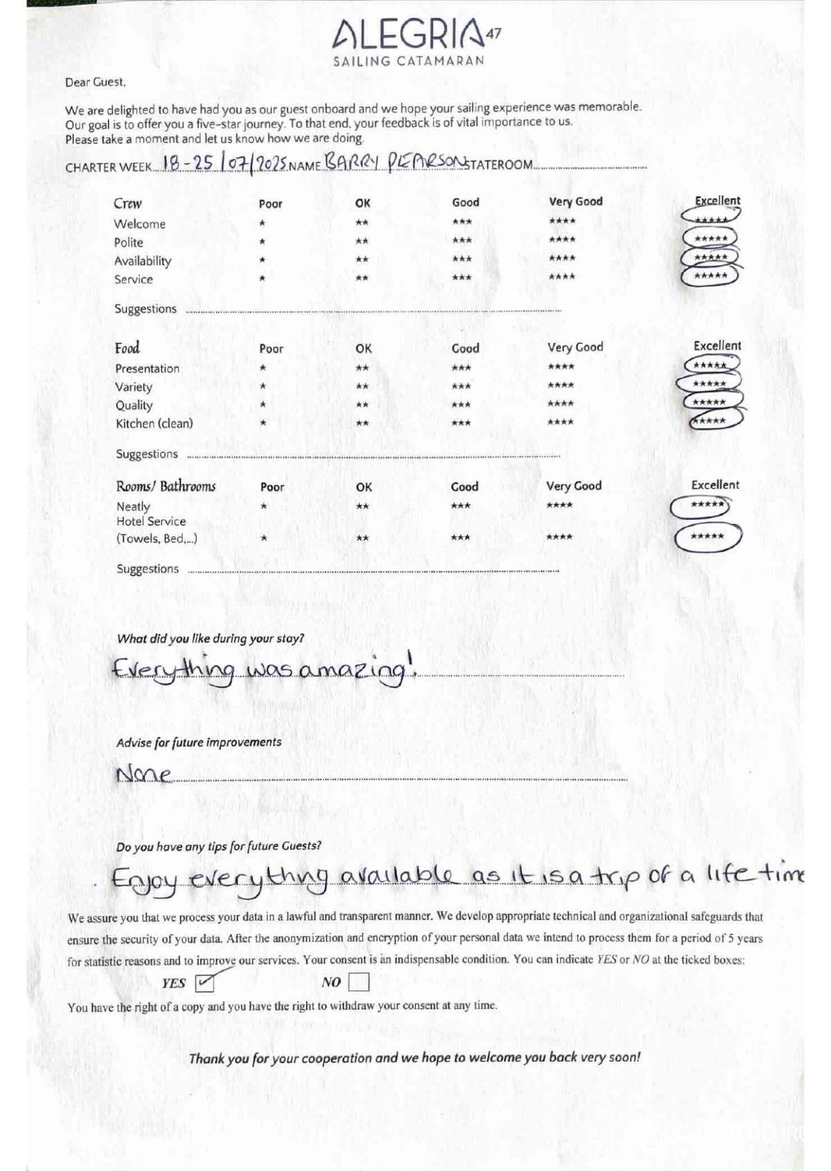 For a sailing catamaran like ALEGRIA, the expected APA is 20% to 35% of the charter price (€2,180 - €3,815), making the charter cost €13,080 to €14,715. Exact amount will be confirmed after inquiry.