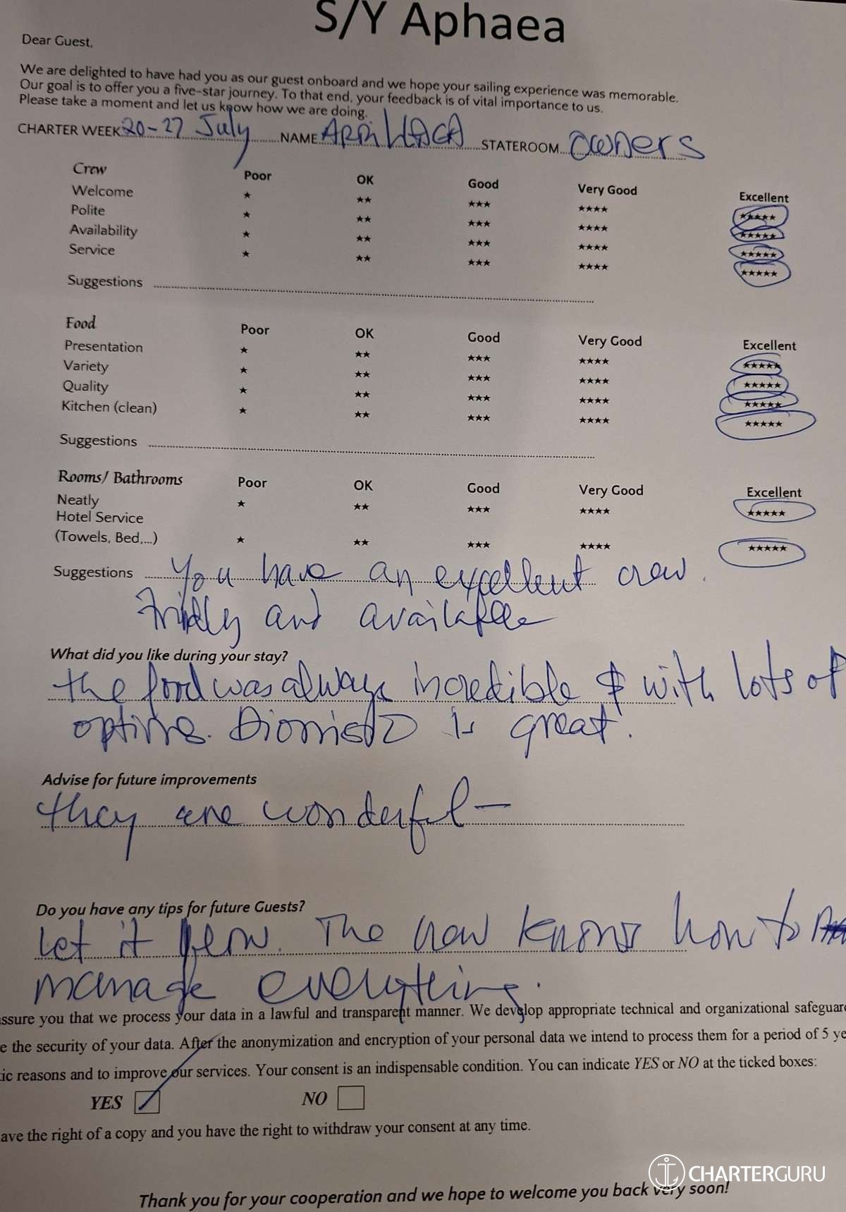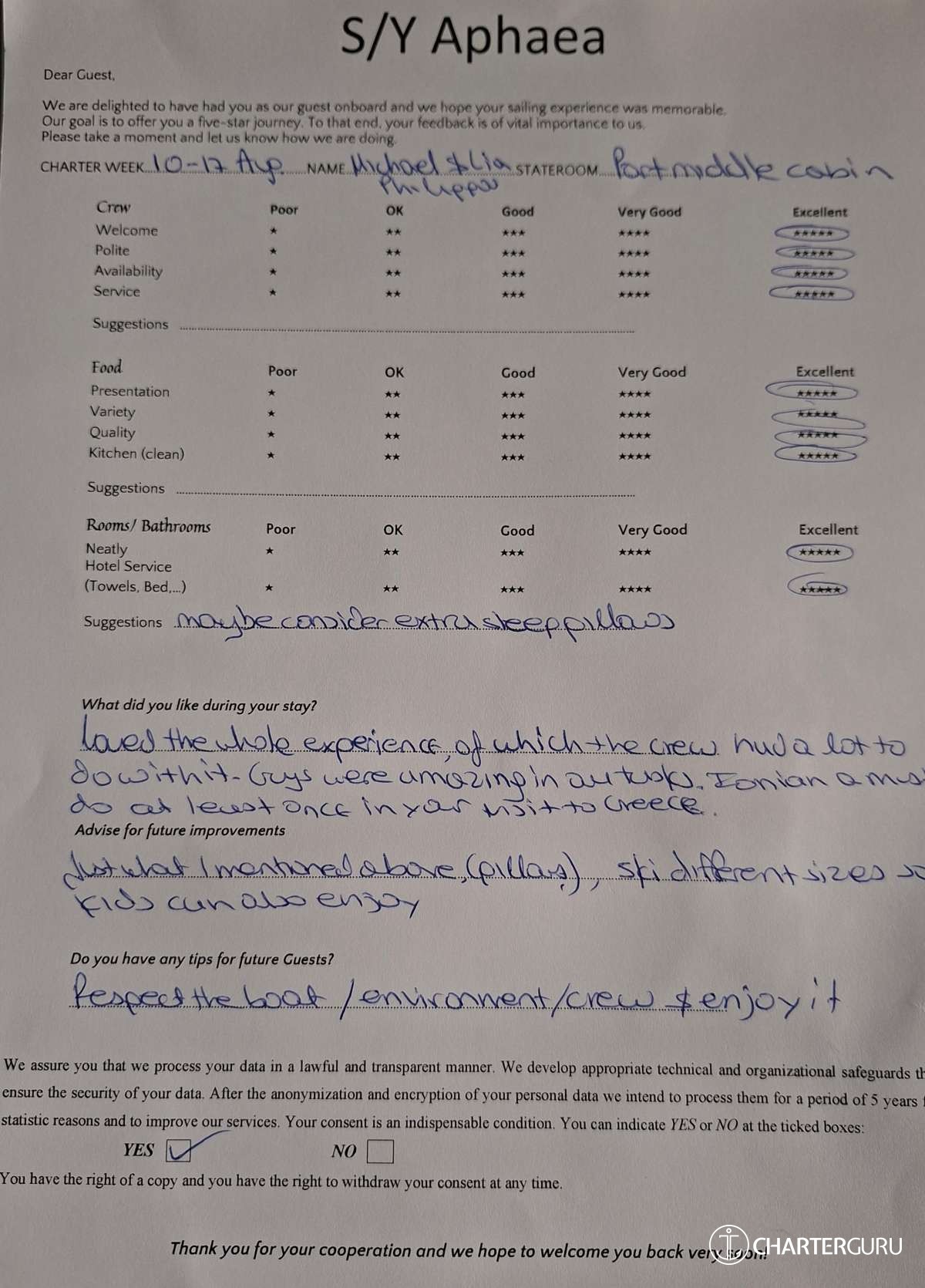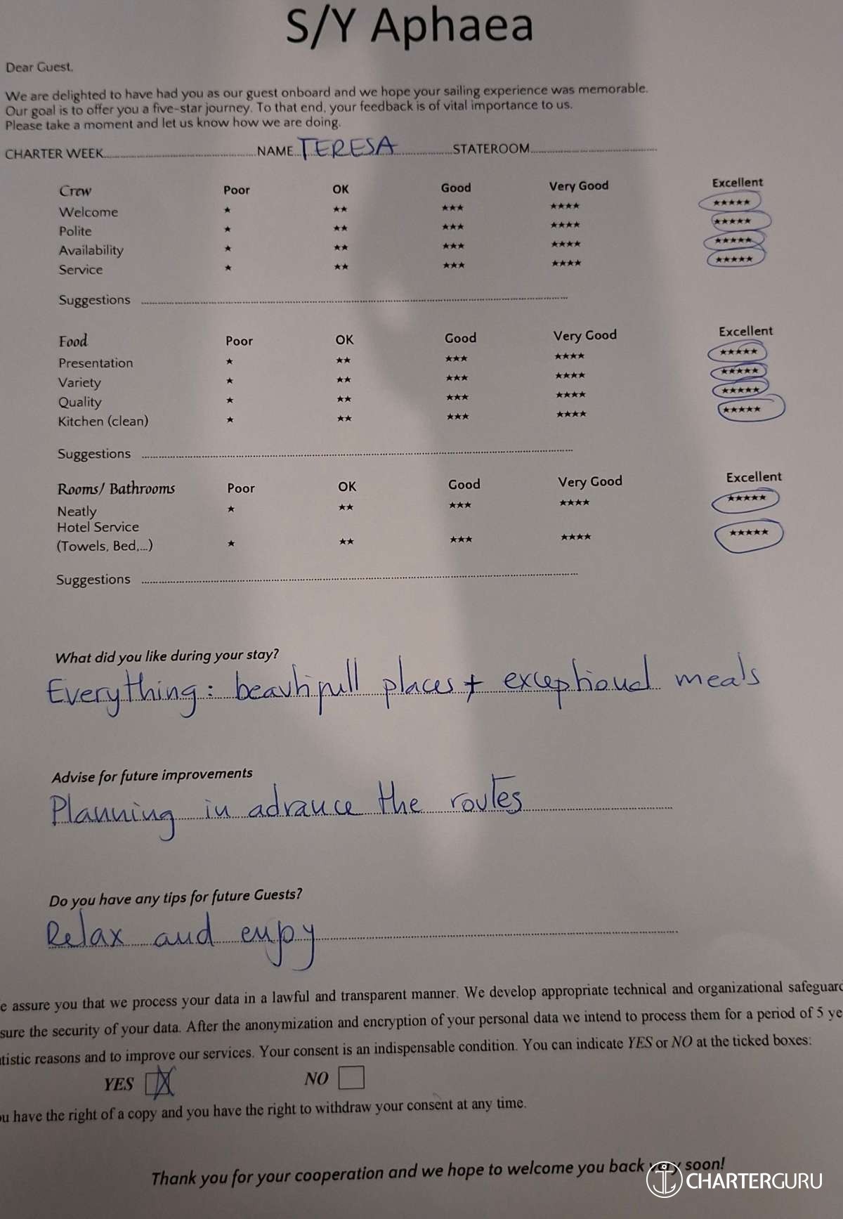 For a sailing catamaran like APHAEA, the expected APA is 20% to 35% of the charter price (€6,700 - €11,725), making the charter cost €40,200 to €45,225. Exact amount will be confirmed after inquiry.