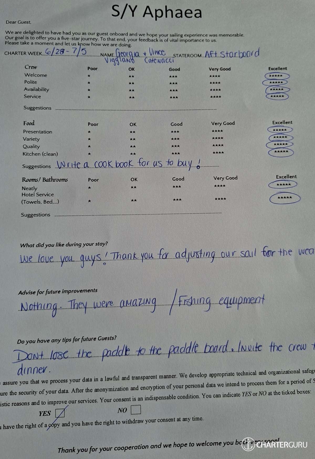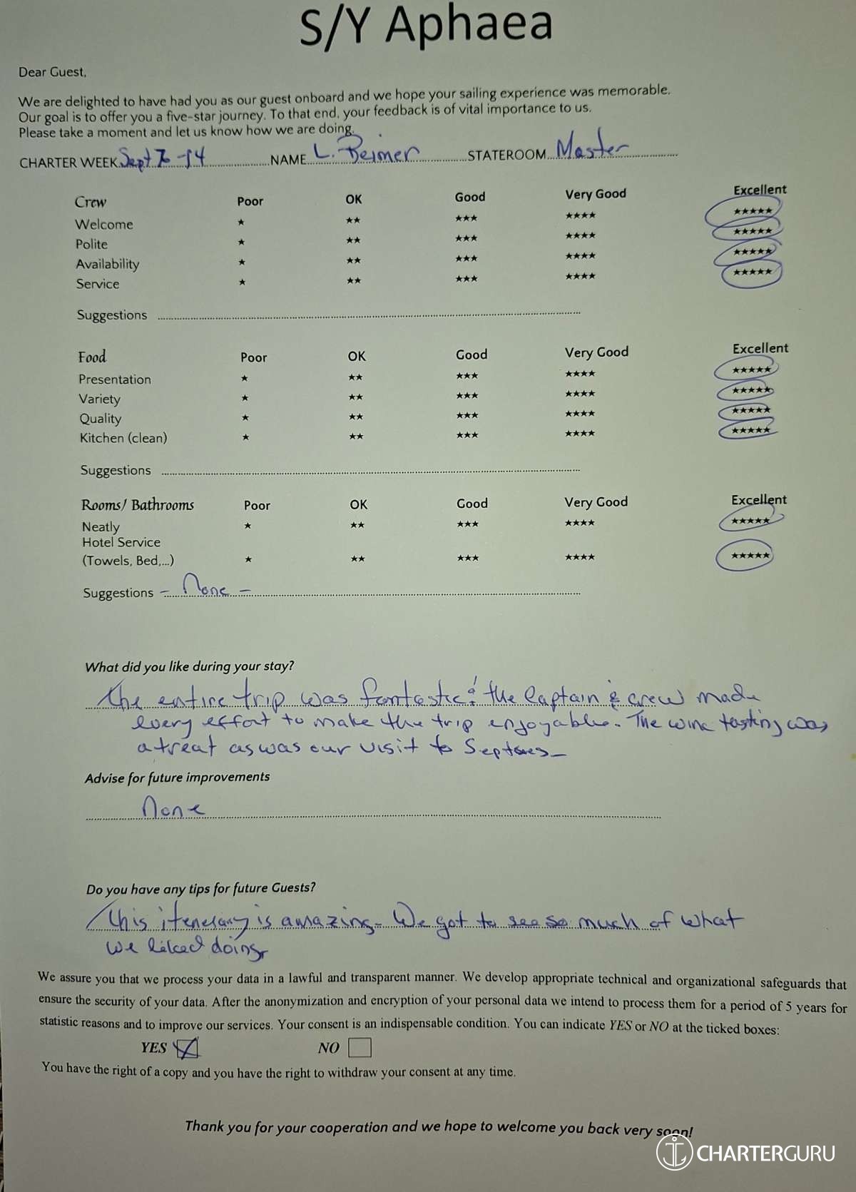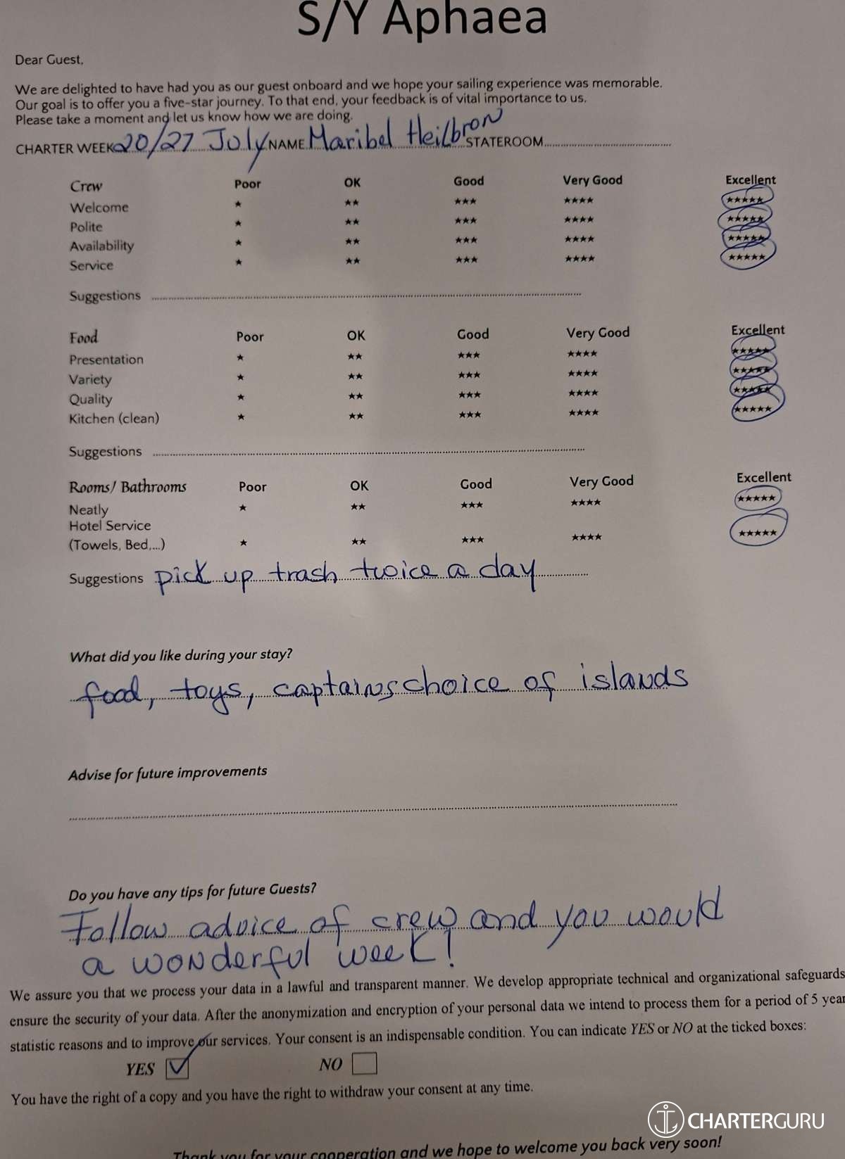 For a sailing catamaran like APHAEA, the expected APA is 20% to 35% of the charter price (€6,700 - €11,725), making the charter cost €40,200 to €45,225. Exact amount will be confirmed after inquiry.