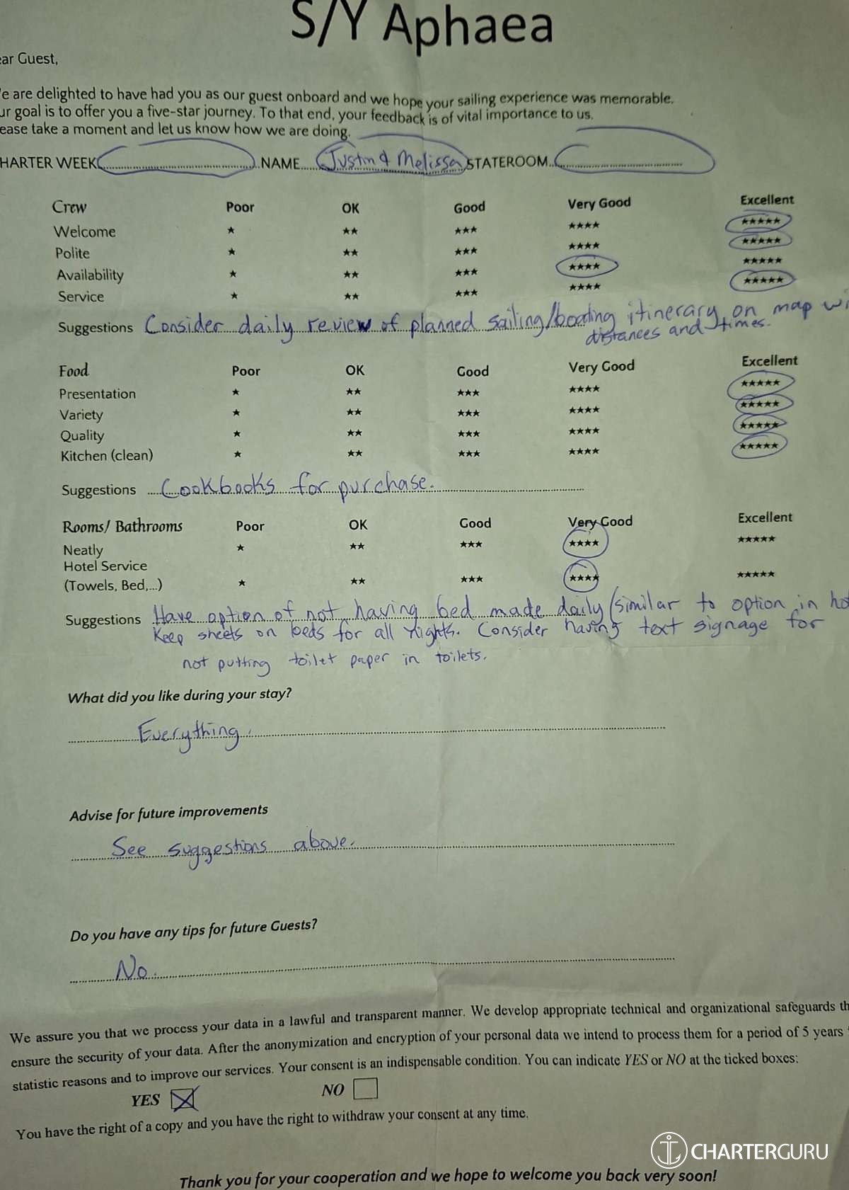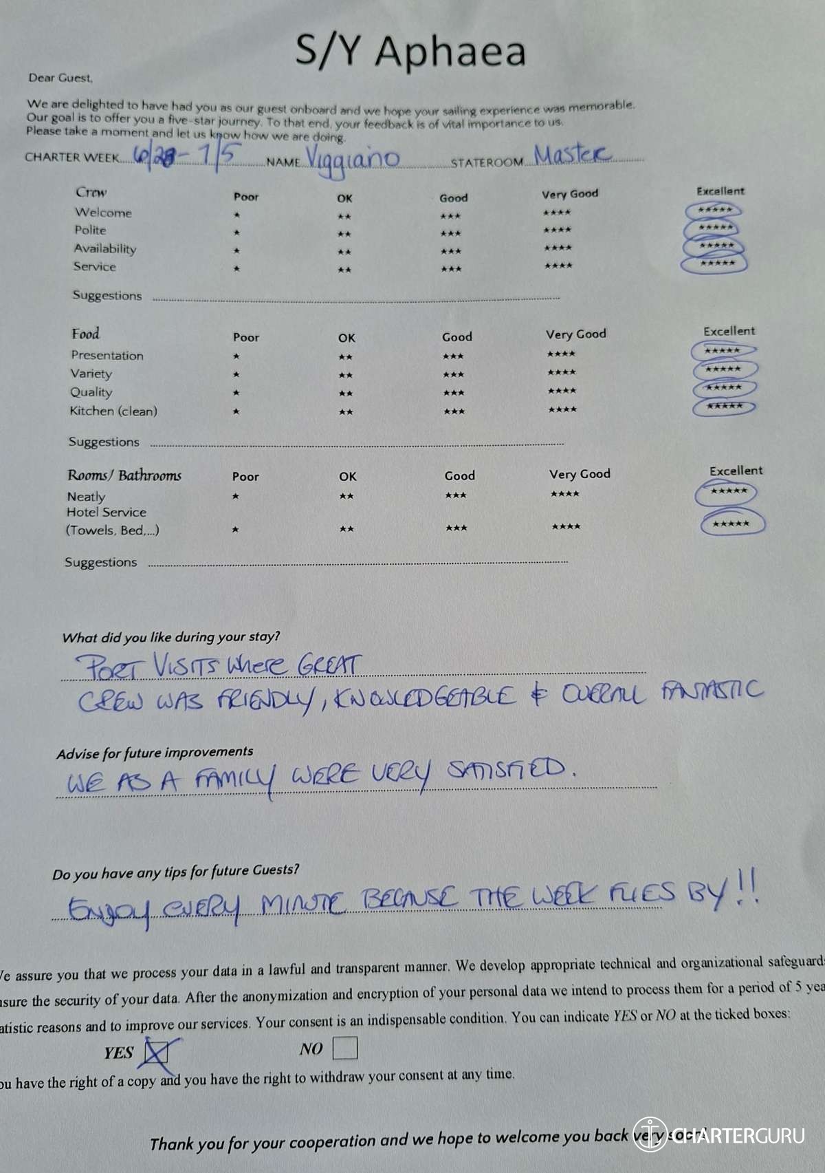 * Please note due to logistics, charters with embarkation or disembarkation in Santorini will be charged one extra day + 6,5% VAT.