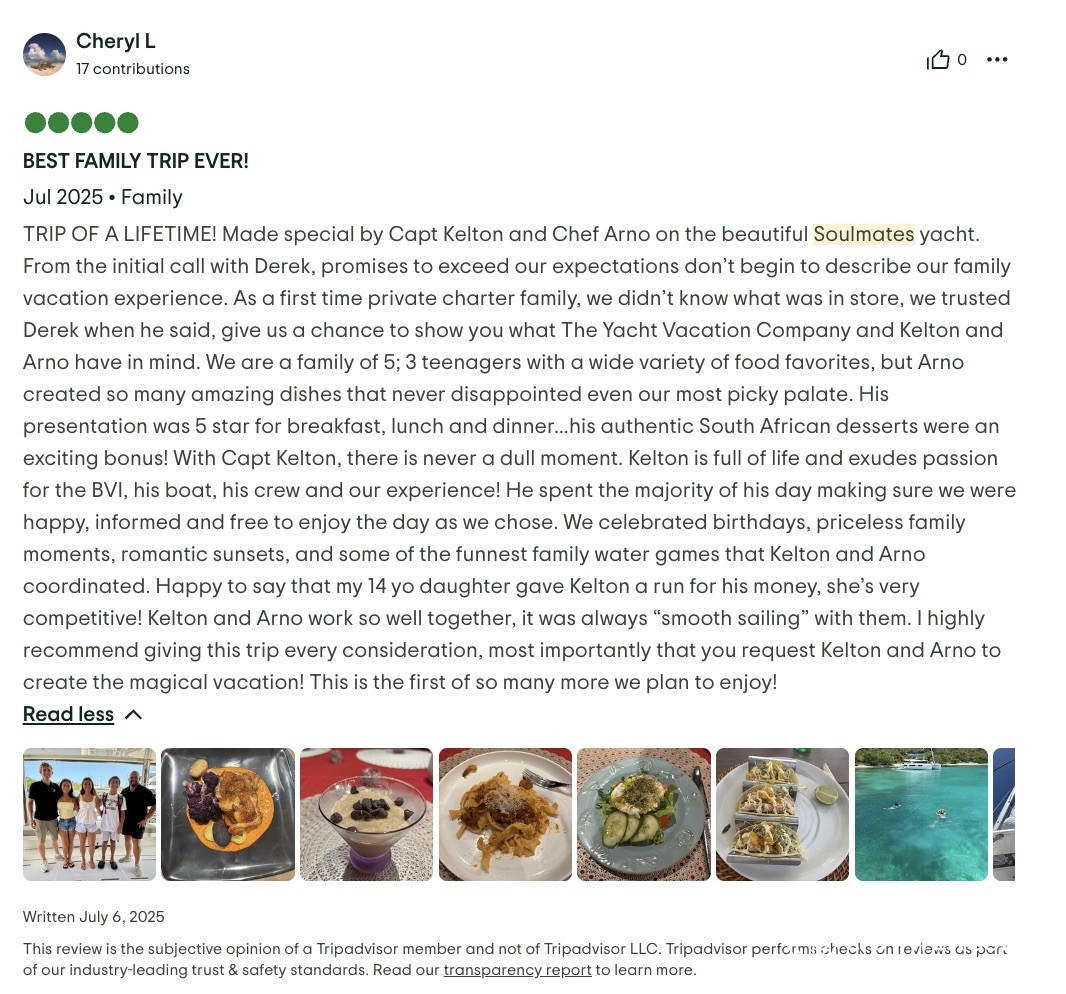 7. Any tandem charter involving multiple yachts requires the guests that paid for a specific yacht and are on that yachts manifest to be the only guests on that yacht during meal services, while underway, and overnight sleeping. This is due to safety and maritime requirements. Pickups outside of the BVI have a relocation fee.