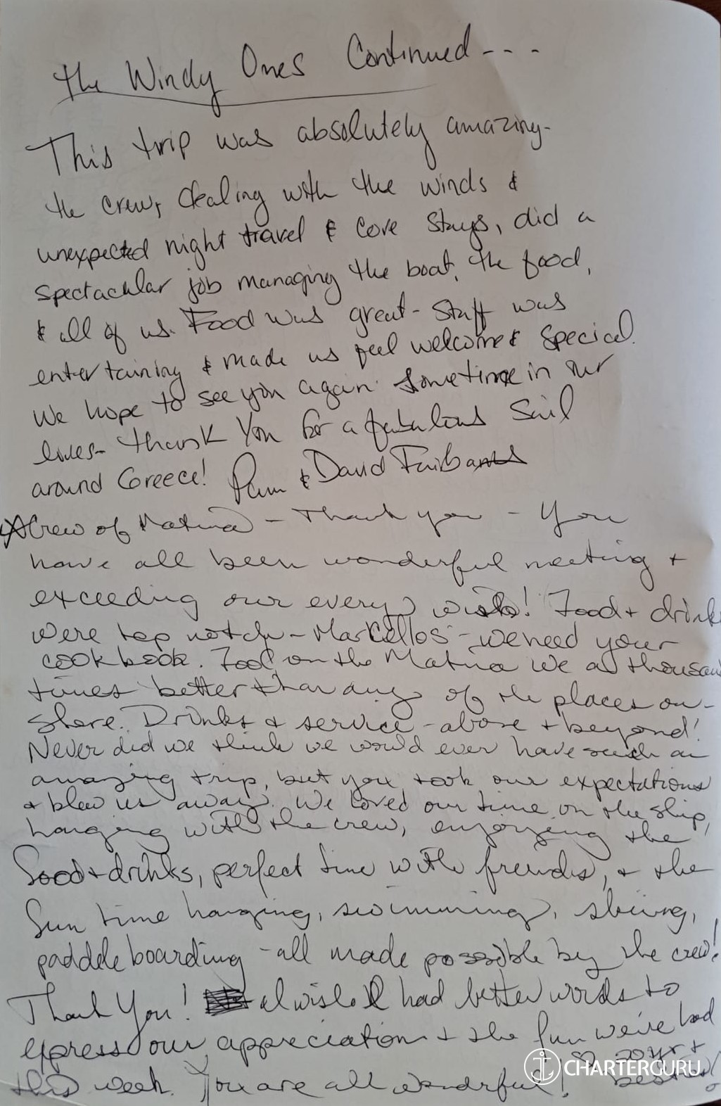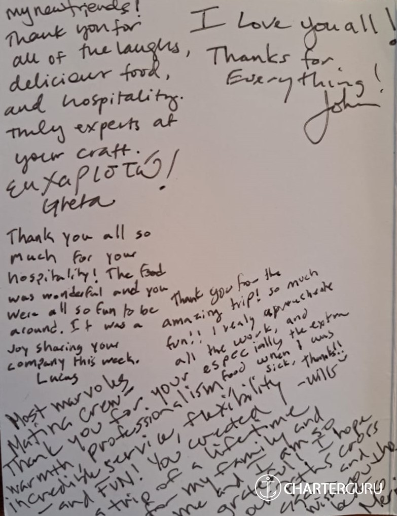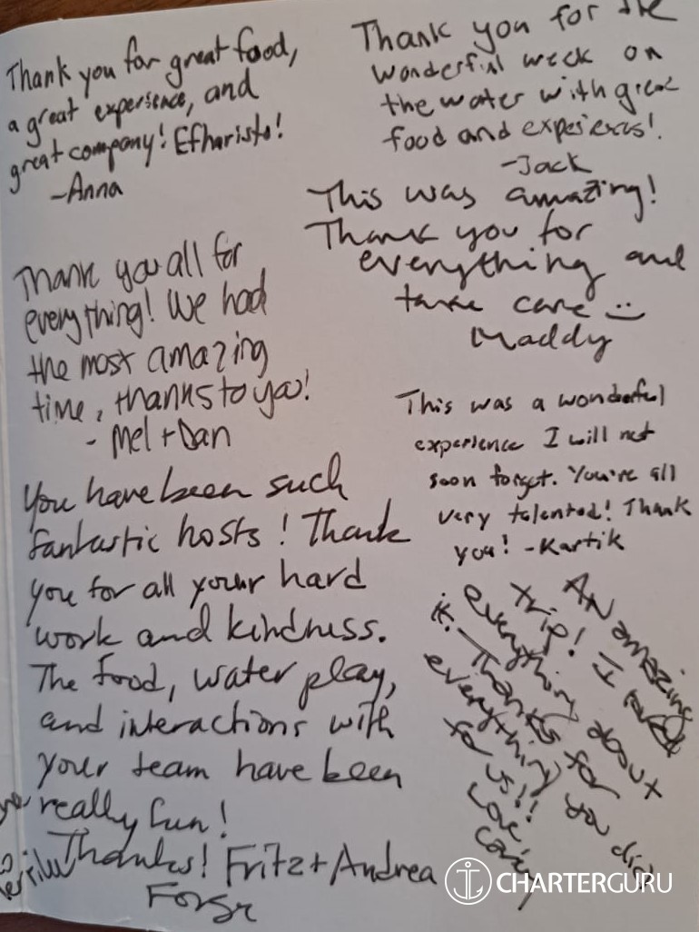 • Half board service 65 EUR per person per day, and full board service 90 EUR per person per day - including local wine and beer with the meals (Any other alcoholic drinks needed will be ordered separately and at the clients' expense.). If we have excessive consumption of alcoholic drinks during the charter, it will be extra, at the Charterer's expense. Soft drinks, coffee, tea and snacks are also included in the above rates.