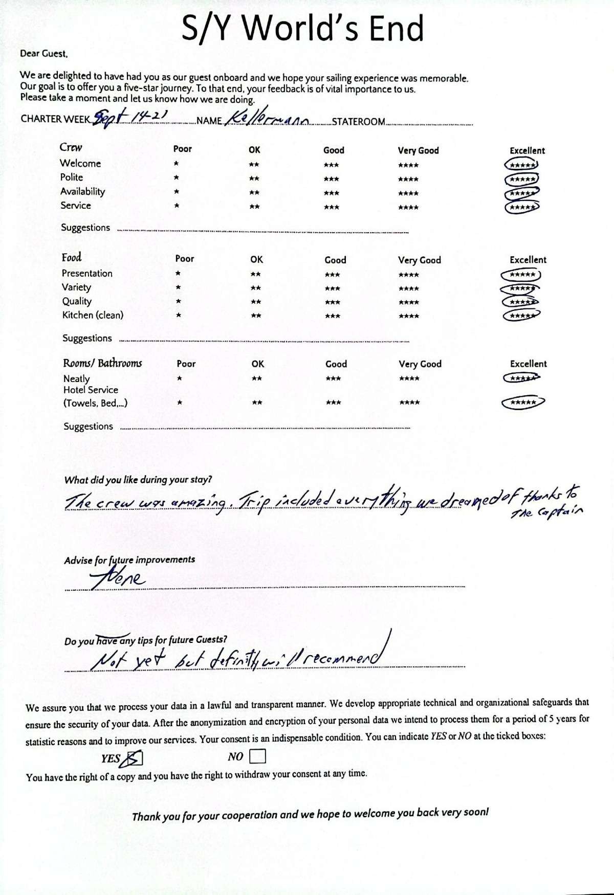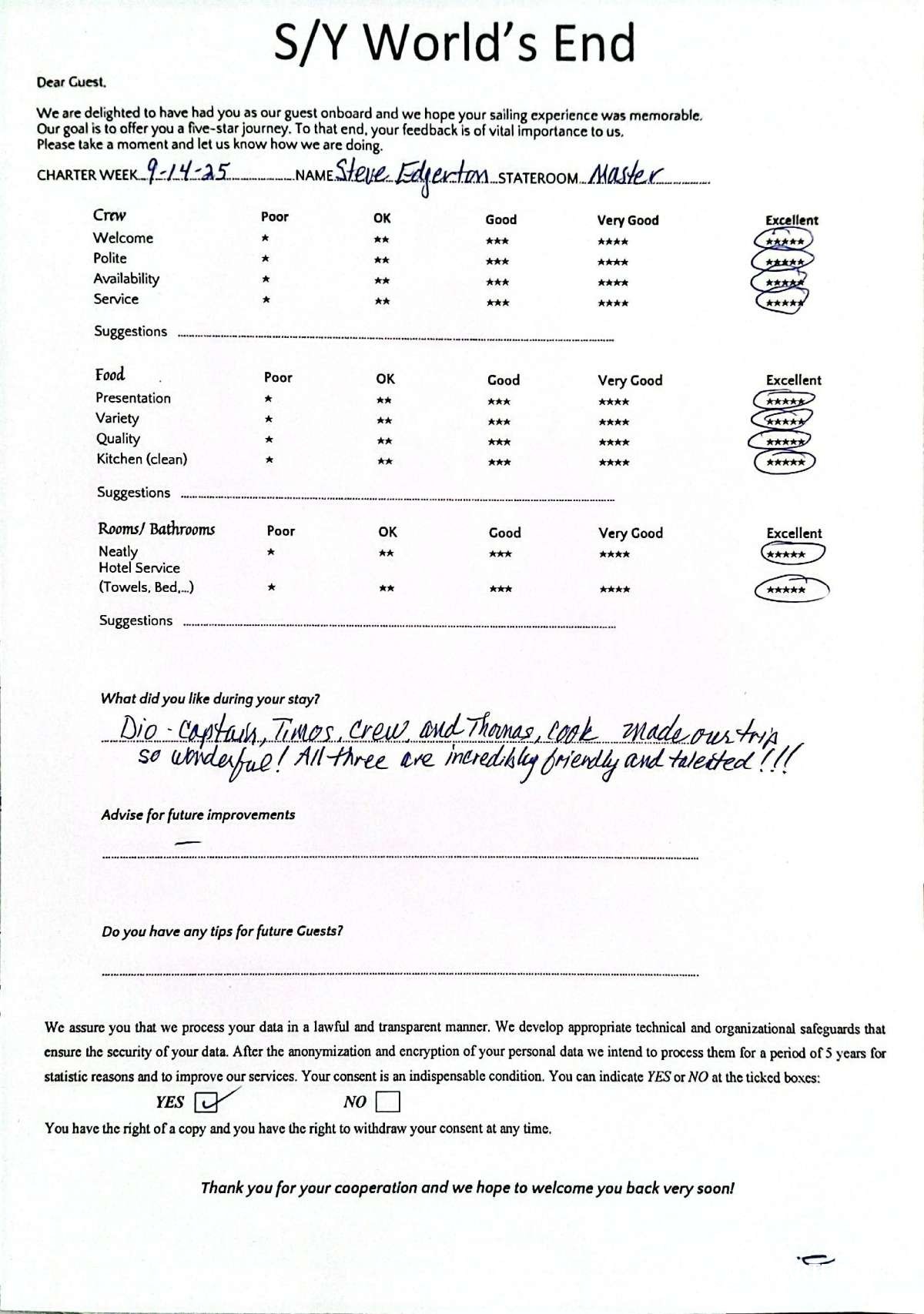 We can't thank you enough for all you did to make our stay on board. World's End was so special! Your attention to every detail, effortless seamanship, wonderful cusine will be one of our very special memories. Fair winds and seas to you all.