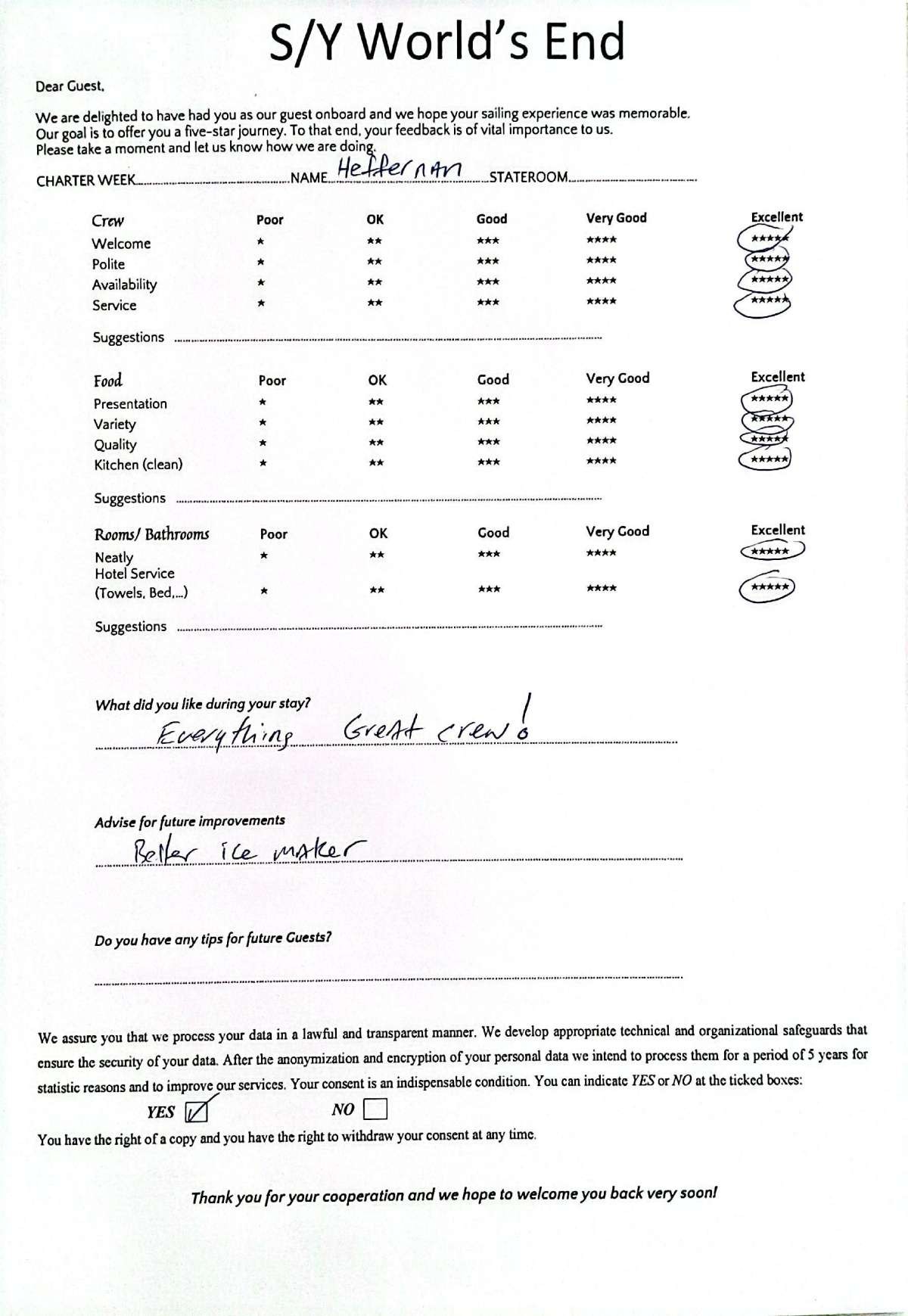 Our voyage was fantastic. We could not have asked for a better crew to be with for ten days. You made everything special and perfect. The King made sailing the Worlds End look easy & fun. Zeta & Iris worked very hard to make him look good.
