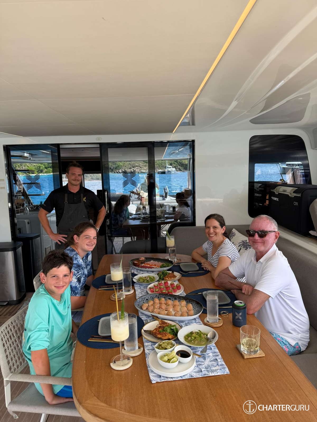 Thank you for such a magical week aboard Aeolus. From the minute we arrived (and before) we felt taken care of. Our otherwise stressful arrival was made easier by your calm and confident attitude. That transpired into the diving and the kids comfortably got certified under your guidance. We loved all of the boys and activities, from the paddle boards to (especially) the efoils. We cannot say enough about Katie’s cooking. We all anxiously awaited every meal and felt incredibly spoiled with each delicious bite. I am not sure what we will do without Elizabeth’s creative and yummy cocktails.